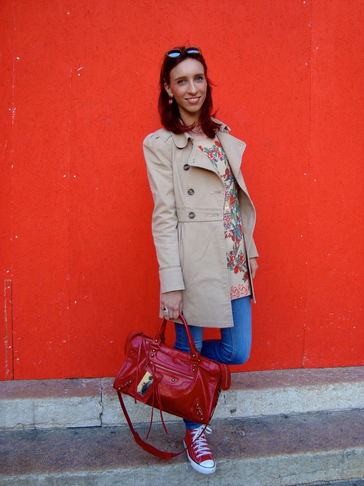 IT: Buona domenica a tutti i miei lettori! Oggi ho pensato di vestirmi in modo casual e, per me, abbastanza giovanile e comune, anche se di solito sono più elegante; modificare lo stile con i diversi look è una cosa positiva e da sempre più voglia di migliorare e perfezionarsi. Il mio outfit di oggi è composto da una maglia di seta a fantasia, jeans molto semplici, all star rosse per riprendere il colore e, sopra, un trench color beige di cotone adatto per questa splendida giornata di sole. L’accessorio che da più luce e fa notare il tutto è assolutamente la borsa, Balenciaga inspired rossa. Oggi ho deciso di lasciare la mia città, Pesaro, per dirigermi a Rimini dove scattare qualche foto e magari visitare qualche negozio per vedere le novità appena uscite per questa stagione 2013.
