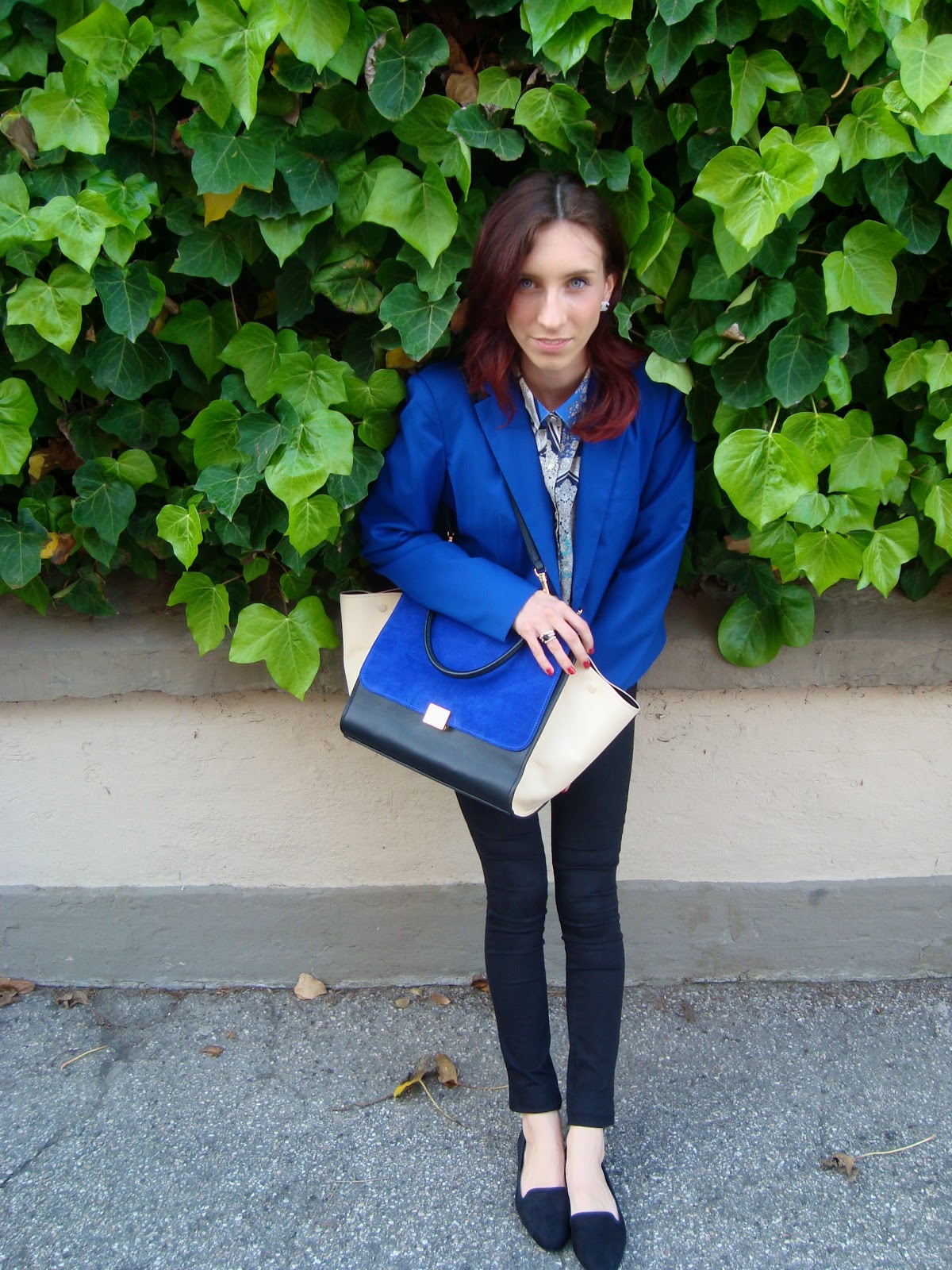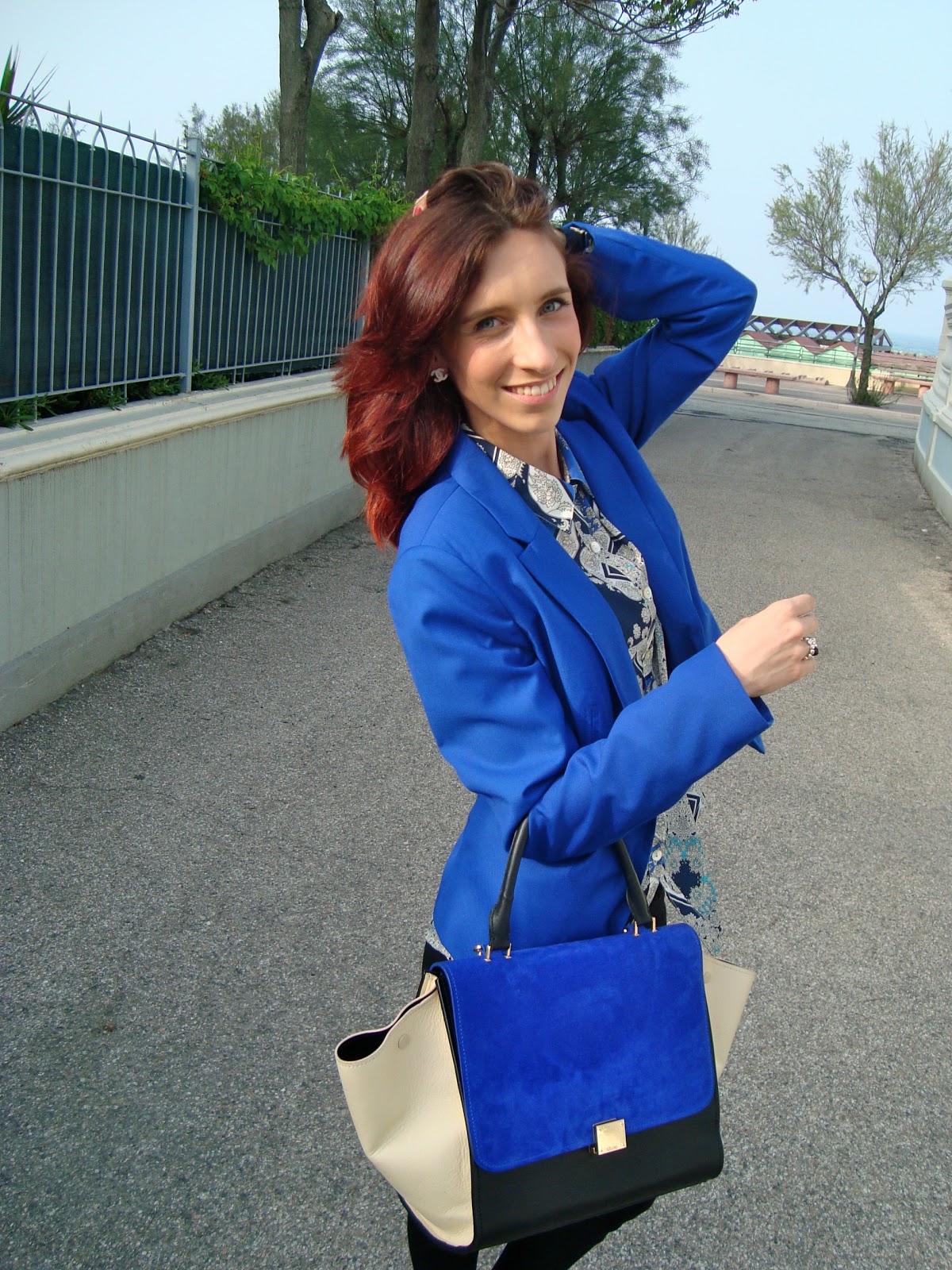 IT: Ed ecco arrivato il classico pomeriggio dove non fare un giro in centro è impossibile, domani niente scuola e quindi l’ho dedicato tutto alle foto. Ho deciso di indossare un look total blue, infatti lo si può vedere sia dalla giacca, sia dalla camicia che con i suoi toni estivi riprende questo stupendo colore, e dalla borsa, la mia adorata Celine trapeze. Il colore che ho abbinato a questa tonalità è il nero, il colore per eccellenza simbolo di eleganza. Avendo una camicia con una fantasia con tutti i toni che vanno dal bianco, azzurro Tiffany e blu, ho ripreso il colore chiaro con un orecchino in plexiglass di Chanel.