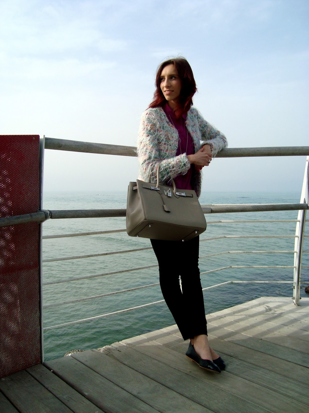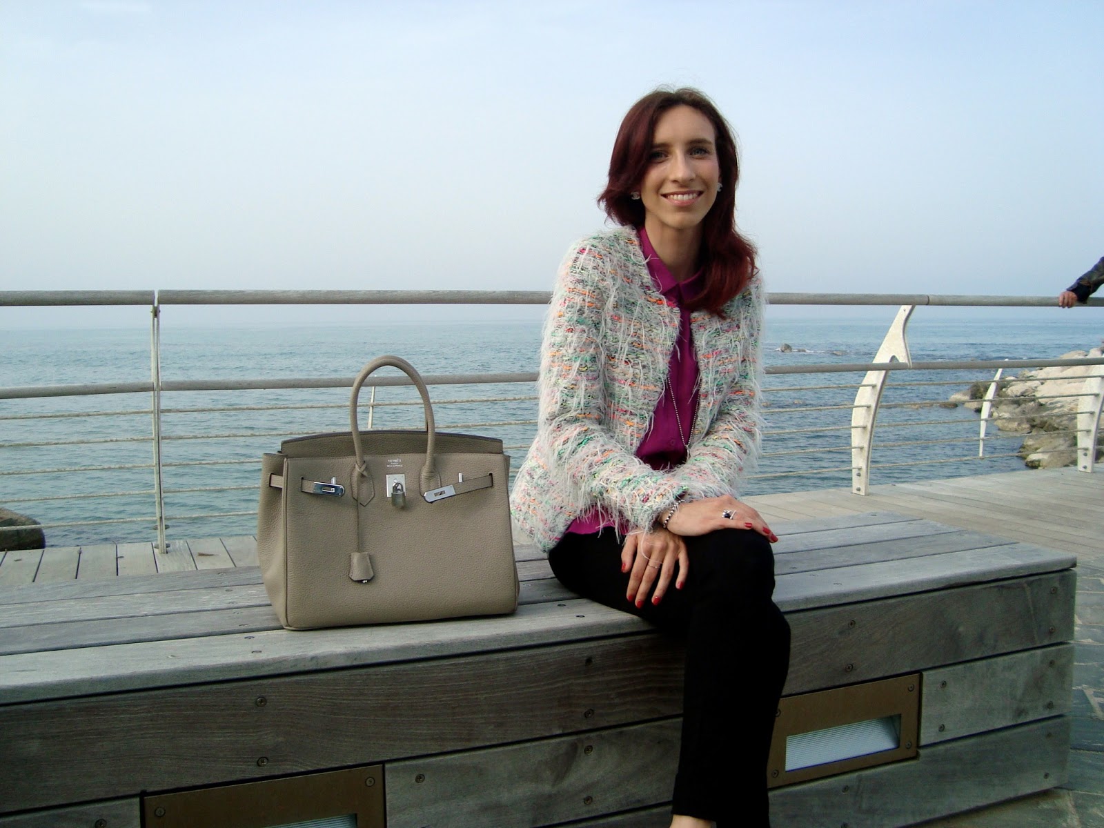 IT: Questo lunedì ho deciso di uscire un pò e dirigermi verso il mare, il posto che più preferisco, per scattare qualche foto e mostrarvi il mio look in questa giornata di sole. Ho deciso di indossare abiti semplici ma di effetto per fare capire che anche con dei capi comuni e abbastanza facili da trovare può uscire un ottimo outfit adatto ad ogni occasione. Questo look mi ricorda una donna d’affari che va a lavoro, non so perchè ma l’abbinamento con ”la signora delle borse”, ovvero la Birkin di Hermès, mi fa pensare alla classica donna pronta per sfidare le avventure di ogni giorno. Ho pensato di abbinare questa borsa color tortora con una giacca multicolore e riprendere il fucsia con la camicia di seta. A parte questi due capi il resto è tutto di colore nero tranne un accessorio molto importante che spicca, cioè la collana di Tiffany. Spero che questo outfit vi piaccia, vi lascio dare un’occhiata alle altre foto scattate e buon lunedì sera!