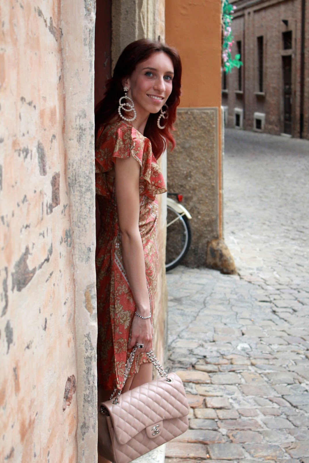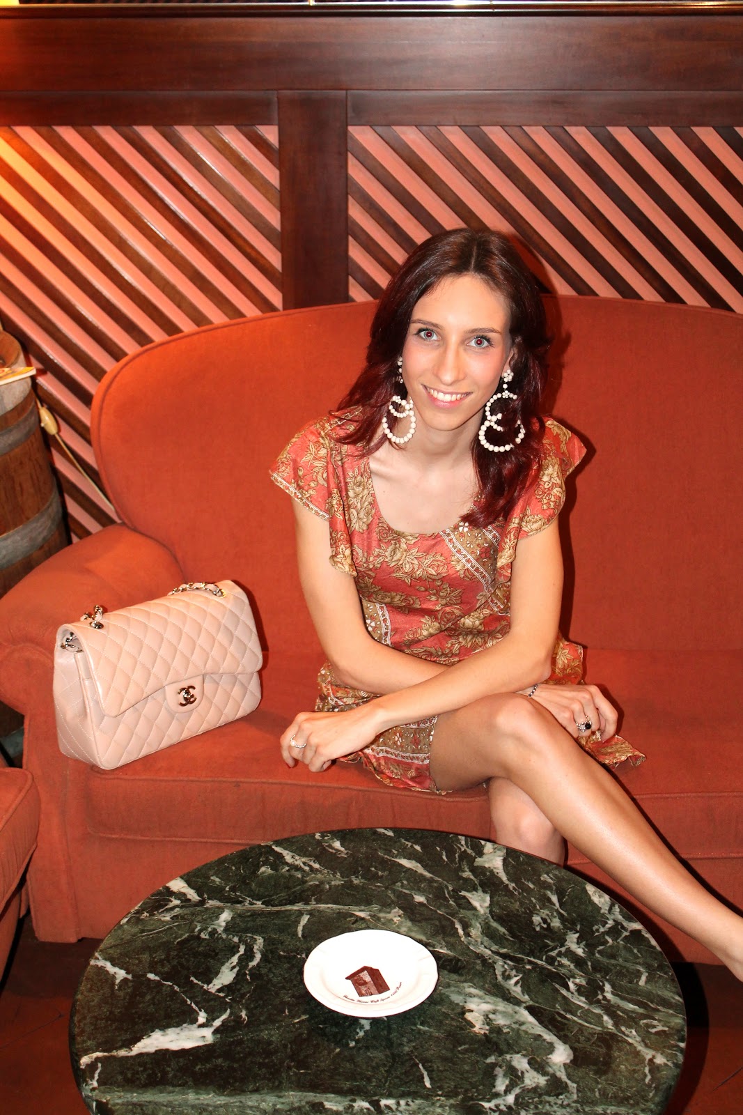 Con il post di oggi vi voglio mostrare un look perfetto per una giornata di sole come oggi. Se avete notato ho cambiato location con questo outfit, ho abbandonato i luoghi all’aperto per mostrarvi un bar della mia città, che è soprattutto un punto d’incontro per bere qualcosa e magari scambiare qualche parola con gli amici. Senza nemmeno farlo a posta ho ripreso attraverso il mio look i colori della location dove ho scattato queste foto, dando un tocco di stile retrò all’insieme. Oggi ho indossato un vestito leggero semplice che ha la particolarità di avere un fiocco nella parte dietro, sulla schiena. Questo l’ho abbinato ad una ballerina di colore marrone bruciato, must have di tutte noi ragazze che amano camminare sulle comode flat e ad una borsa molto conosciuta sul campo della moda internazionale ovvero la Chanel Jumbo.