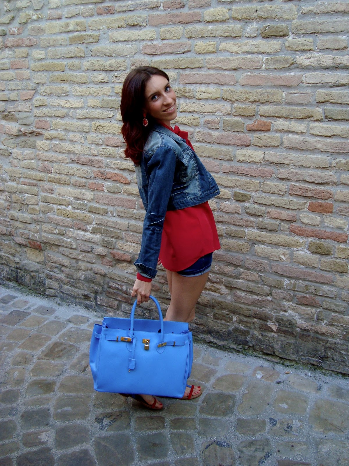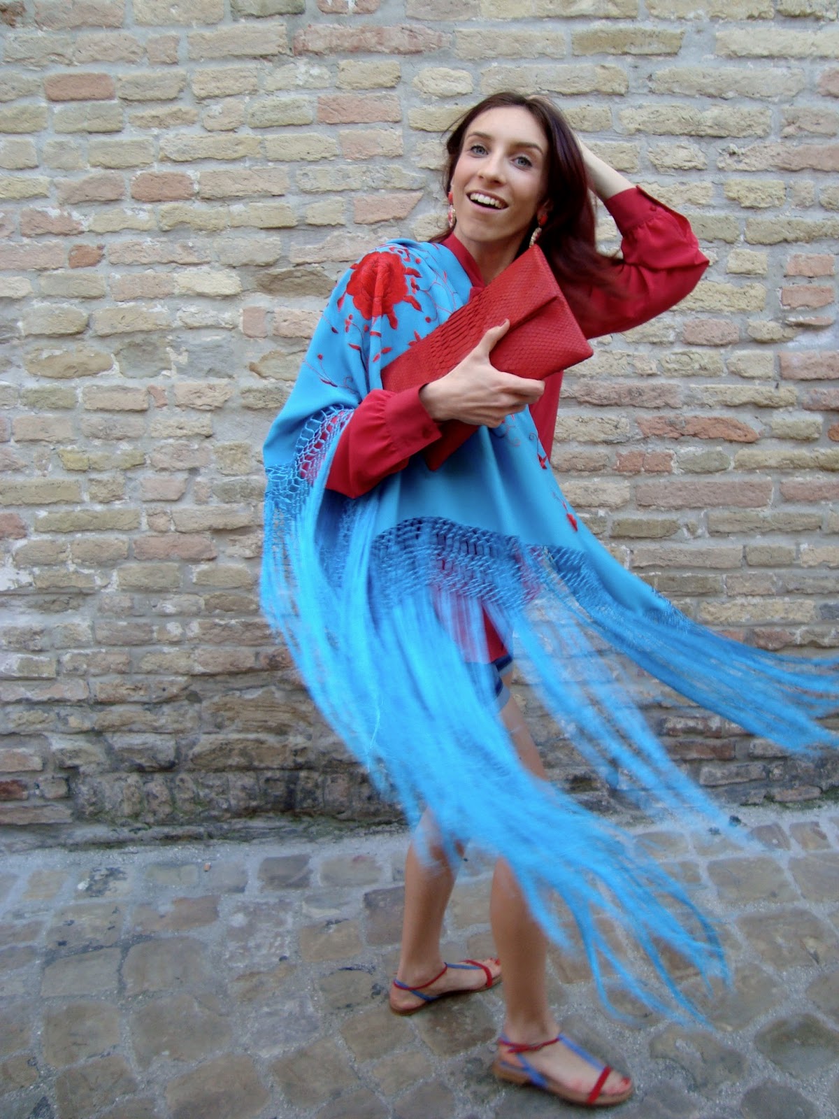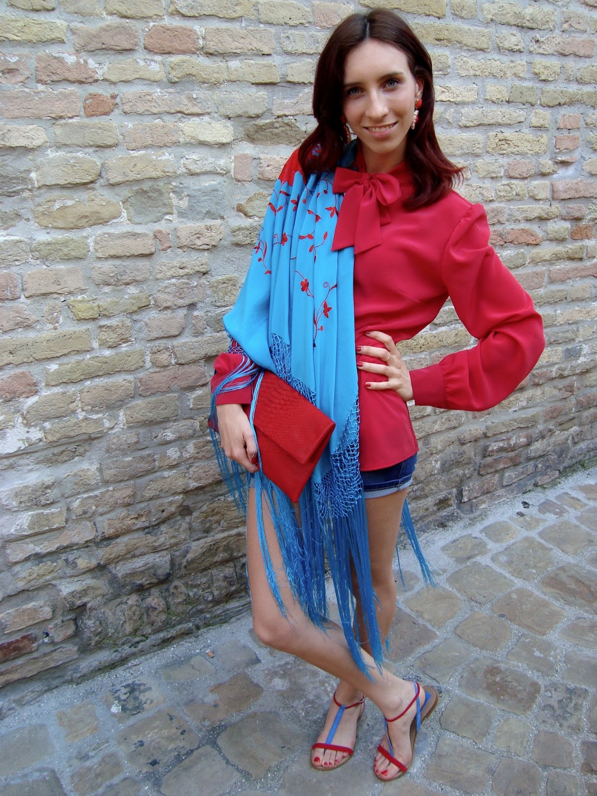 EN: Today I wanted to show how the same silk shirt, with a nice bow in front and the classic shorts and a pair of sandals two colors (red and blue), changing only necklace earrings and handbags, you can create four different outfits for different situations. In the first look I added just a maxi bag of blue color suitable for every day, for a woman full of commitments that can not find a free minute of relaxation, a pair of red and pink earrings pendants and a bracelet from Chanel. In the second match I simply removed the bag and I replaced it with a red snakeskin clutch for a look a little more elegant and drink on the beach. In the third outfit I abandoned the casual style making everything a little more magical and retro adding a shawl with fringe. Finally, my fourth look, is simple, using only a gem necklace with turquoise shades on, we will see a lot in this spring-summer 2013.