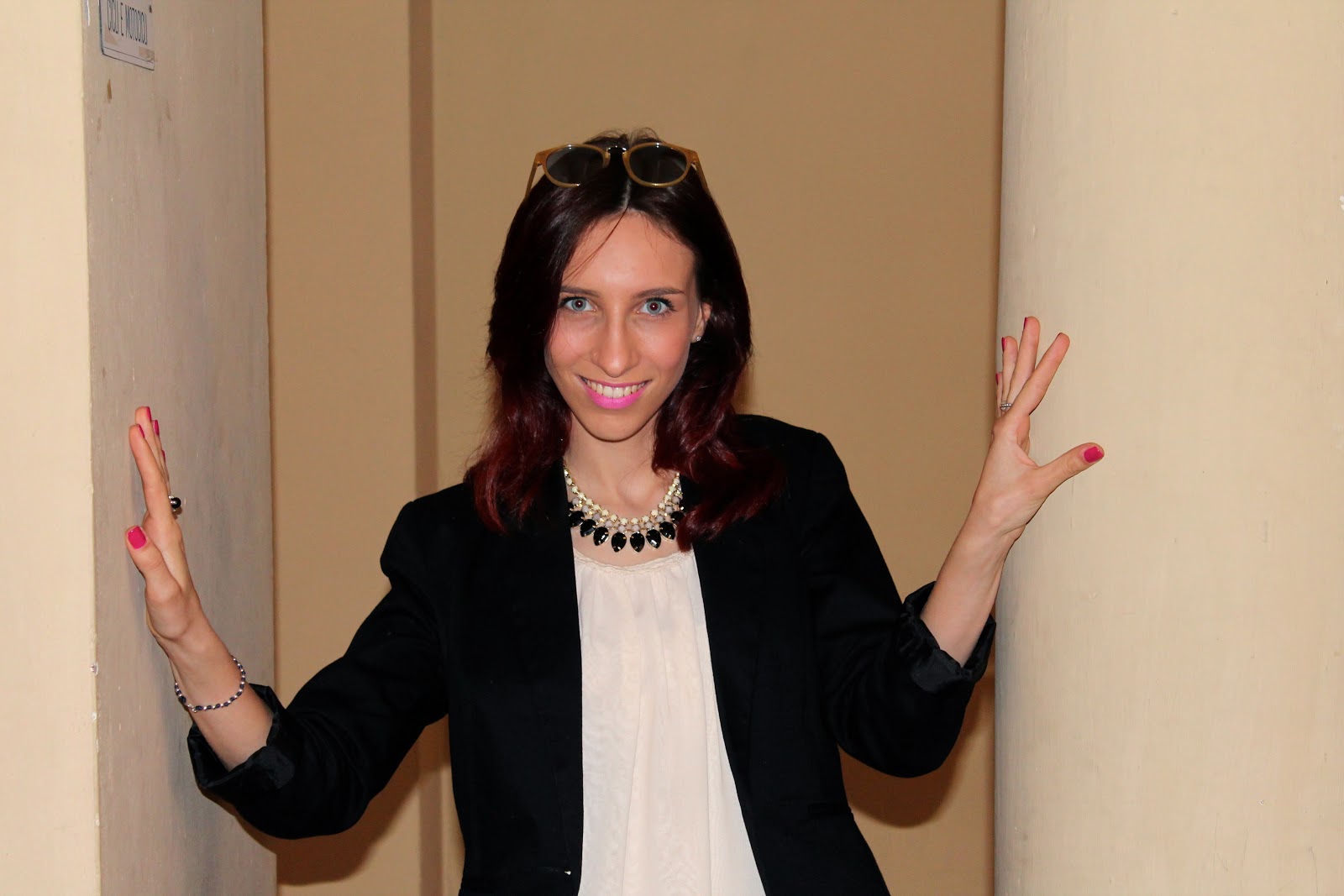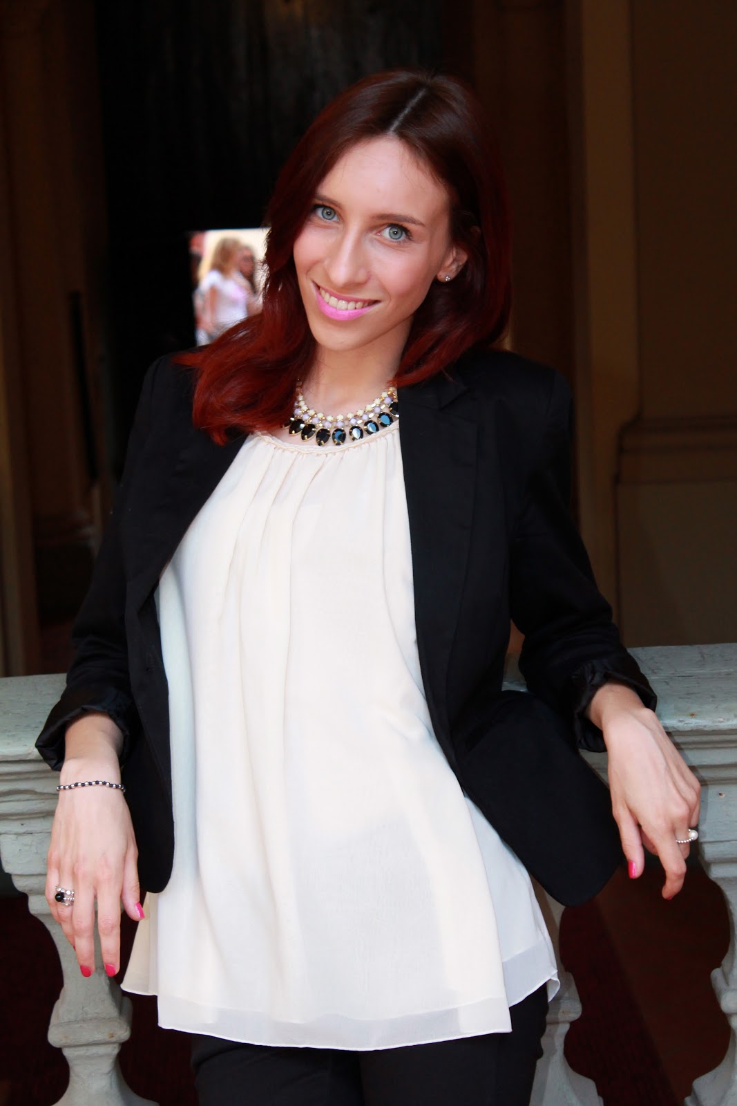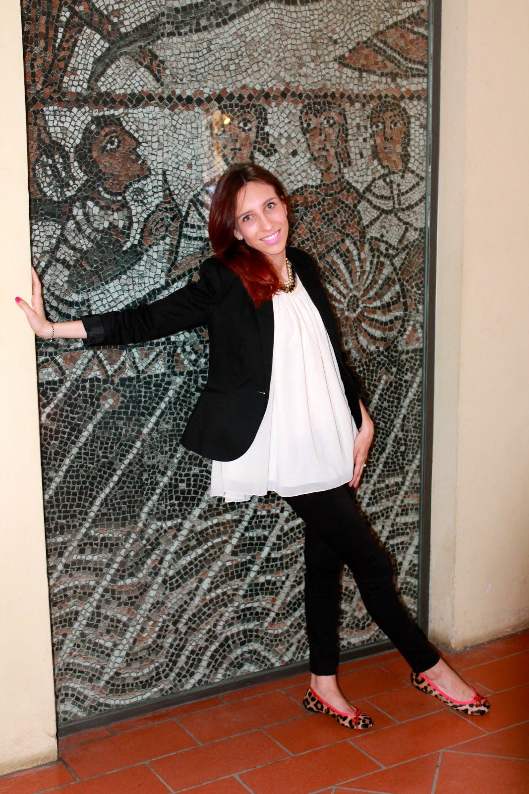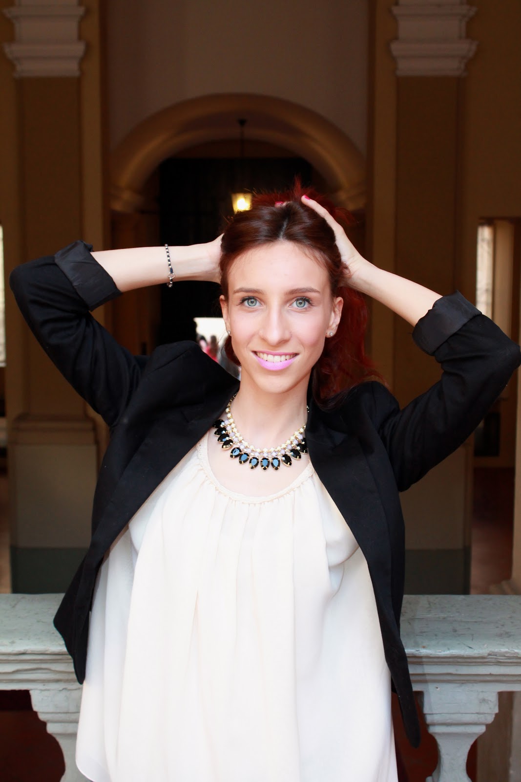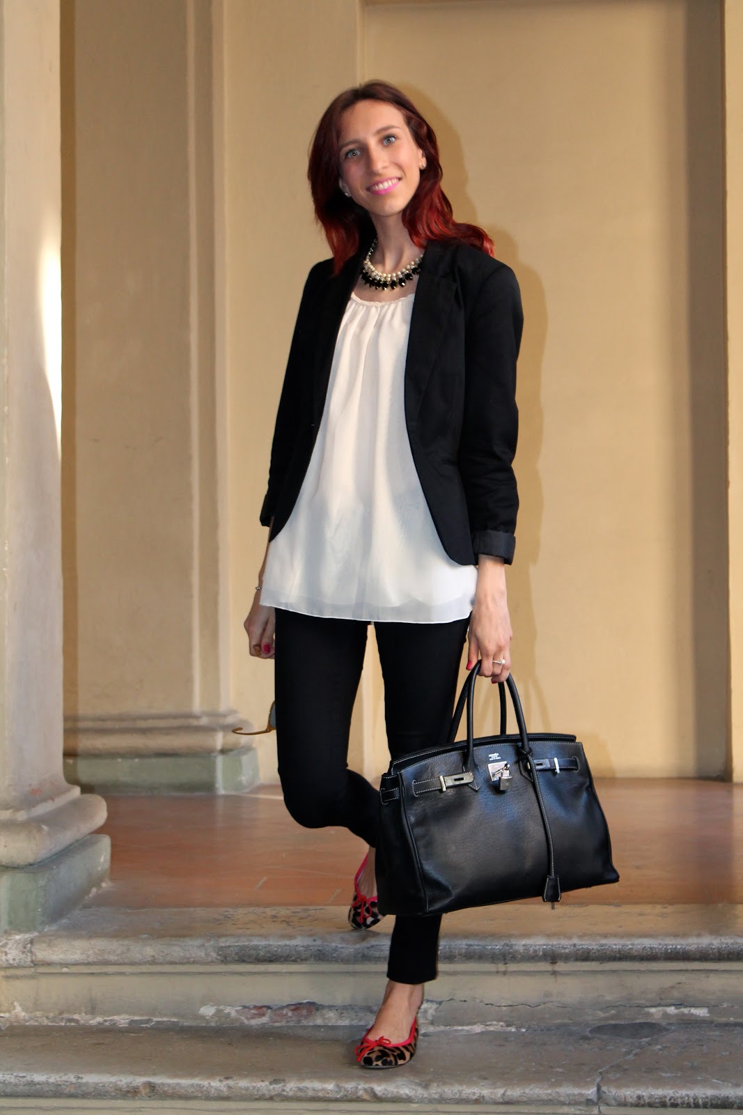 IT: La domenica, il giorno in cui una volta si usava vestirsi bene e andare alla festa del paese, oggi ho voluto in qualche modo ricordare questo giorno e riscoprire le vecchie cose di tanti anni fa. Nel centro nella mia città oggi ho avuto l’onore di riscoprire il famoso vintage, nelle bancarelle, trovando cose deliziose e ricercate perché il bello di questi posti è ricercare in mezzo a tante cose anche accessori, borse e magari anche vestiti, perfetti anche per outfit moderni, adoro mischiare moderno e antico insieme. Oggi ho voluto creare un look elegante, quasi da donna in carriera, come si vede nel film, utilizzando una blusa panna leggermente larga con sopra una giacca nera, non passa mai di moda. Come pantaloni ho utilizzato un paio di colore nero e come ballerine un paio leopardato con un tocco di rosso fuoco per spezzare questo look bianco e nero. Invece che mettere un paio di orecchini vistosi ho pensato di sostituirli come una collana gioiello, tendenza di questa primavera-estate 2013. Di borsa, pensando un look da donna, mi è venuta subito l’idea di indossare la mitica e storica Birkin di Hermès.