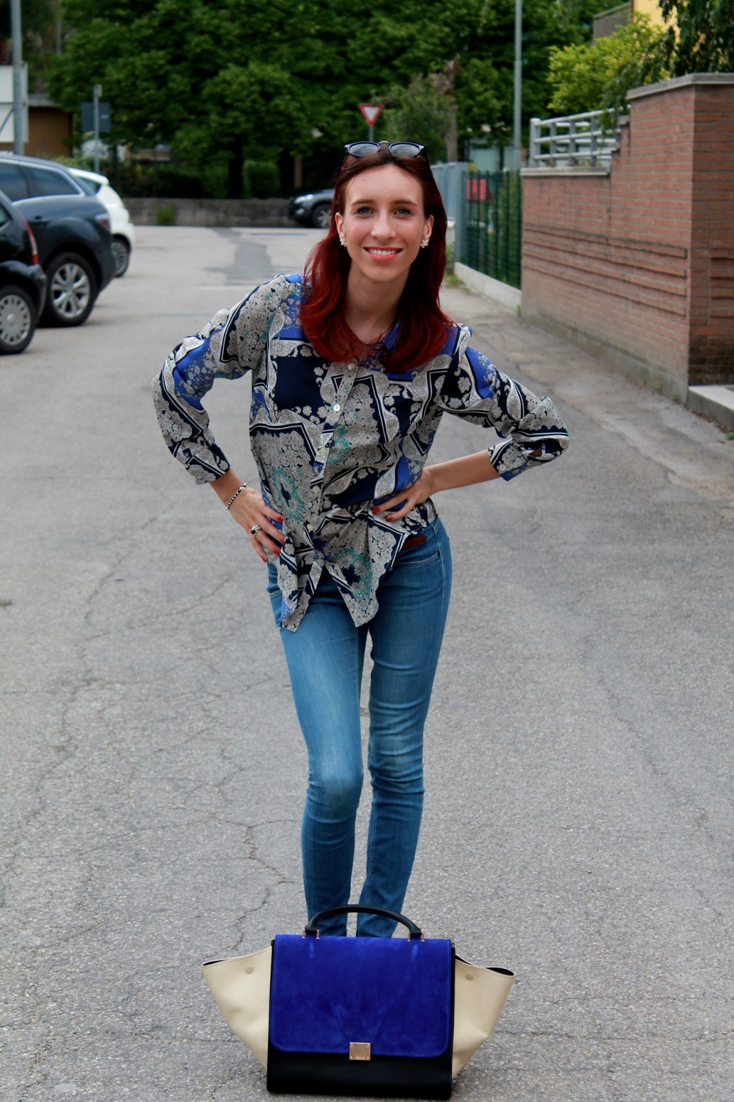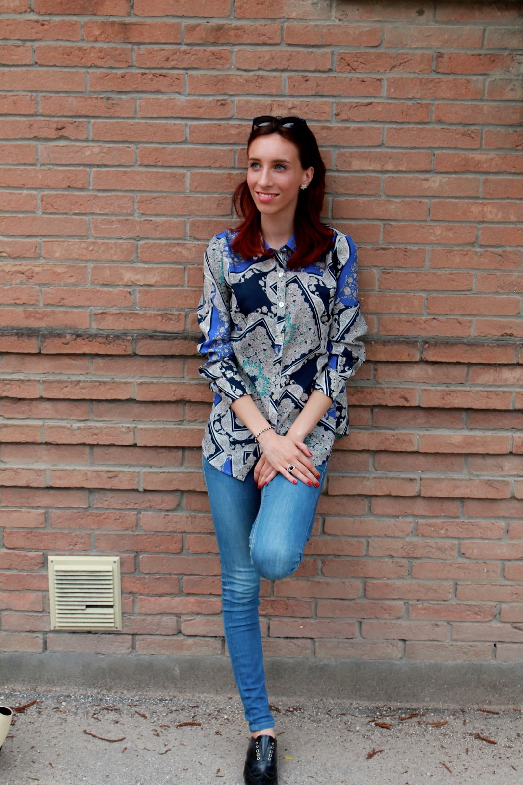 IT: In questa domenica dopo essere andata a mangiare fuori con la mamma per festeggiare questo giorno, i siamo diretti, io, il mio ragazzo e sua sorella, verso il centro commerciale le Befane per un po’ di shopping e per scattare qualche foto. Dopo di che non ero soddisfatta del tutto delle foto e abbiamo pensato di farne alcune prima di entrare a casa. Oggi ho pensato di indossare una camicia a fantasia (usata anche per QUESTO outfit), abbinandola a dei semplici jeans e ad un paio di scarpe stringate genere maschile con effetto spazzolato di vernice. Come orecchini ho usato un paio piccoli a forma di fiore con incastonate delle perline bianche. Di borsa ho utilizzato la mia amata Celine Trapeze, con il suo colore blu sgargiante.