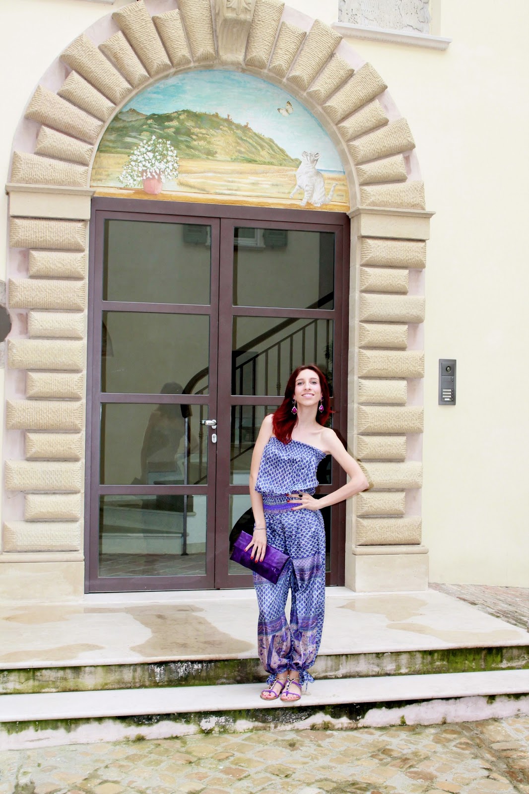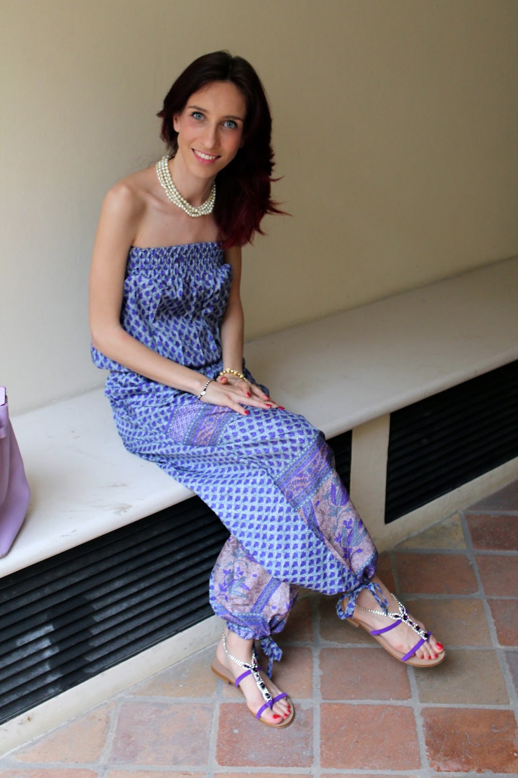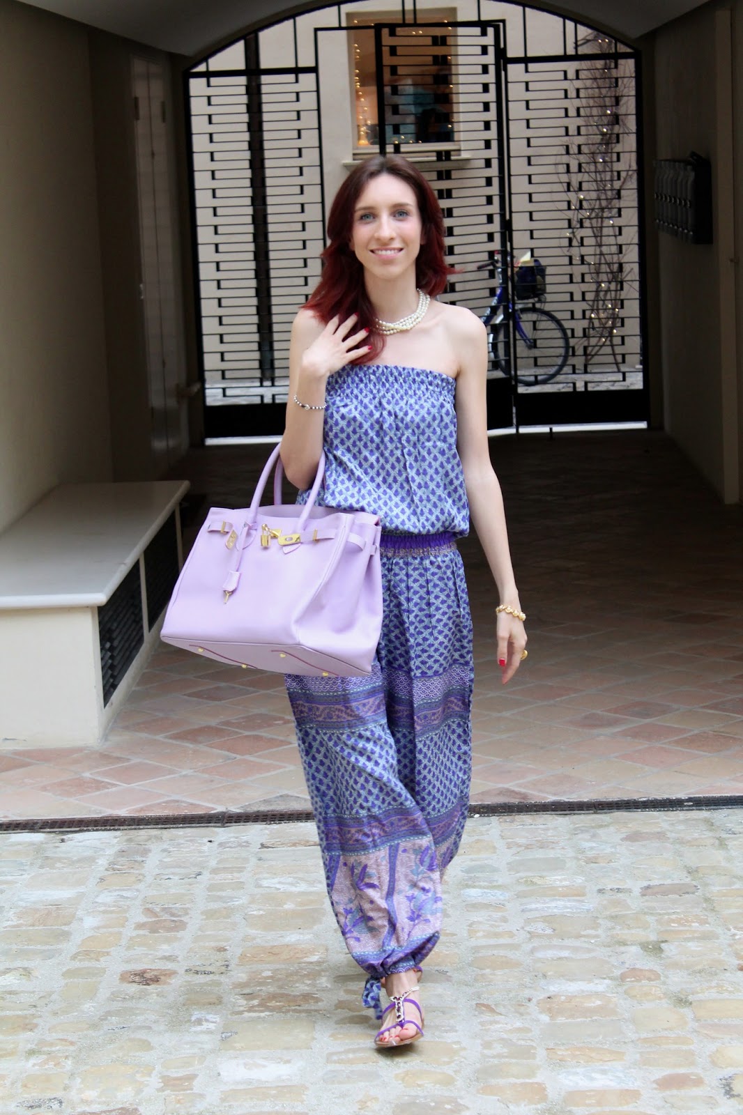 IT: Vi presento un nuovo outfit un po’ diverso, particolare, formato da una tuta a fantasia che ricorda l’Oriente e i suoi costumi, abbinato ad accessori sia moderni che vintage; come si puo’ vedere, per la borsa ho usato il modello della famosa Birkin di Hermès riprodotta in un colore ricercato e non molto commerciale. Ho voluto proporre un contrasto tra bigiotteria americana composta da perle e pietre, che rifà in qualche modo al mondo classico ed elegante, alla classica Birkin con questo colore giovanile e moderno. Ho creato questi due esempi di look, il primo perfetto per il pomeriggio e il secondo adatto alla sera e ad un aperitivo in spiaggia, per fare capire che usando anche lo stesso vestito e magari cambiando solamente la borsa o gli accessori si possono costruire due outfit completamente diversi.