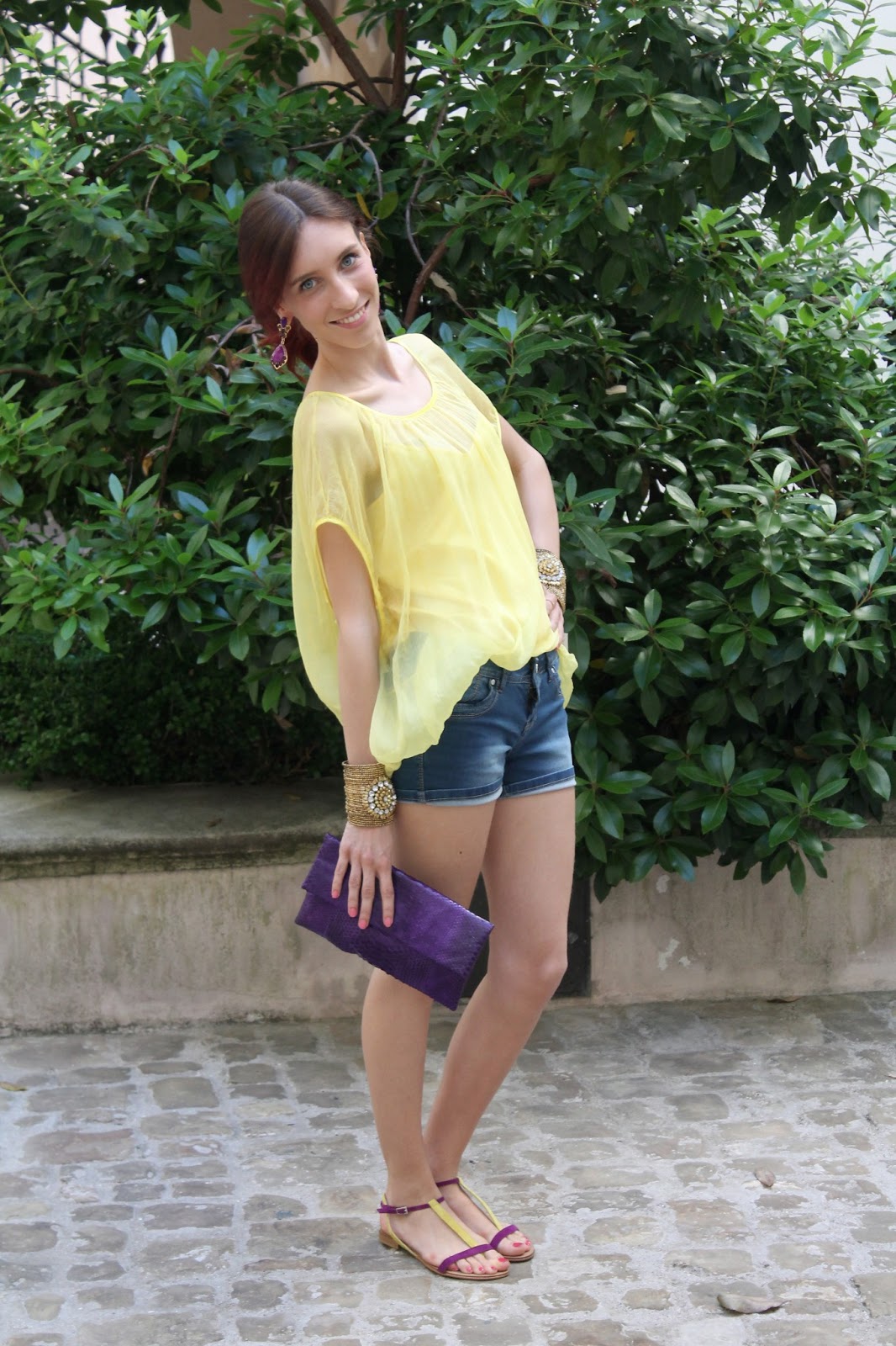 IT: Cosa c’è di meglio che dei bei colori accesi per questa primavera? io con questa idea ho costruito il mio look per oggi, fresco leggero e soprattutto sbarazzino. Questo outfit è composto da una maglia velata gialla e dei classici shorts di jeans, abbinati con degli accessori oro e viola come si può vedere sia dagli orecchini che dai bracciali. Il pezzo forte del look è sicuramente il sandalo bicolore che riprende i colori dell’intero outfit. Vi piace?