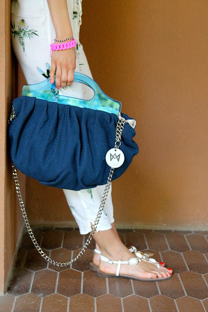 EN: And here is the last outfit I used for the event Pitti Immagine, which took place in Florence at the Fortezza da Basso. I wanted to create a perfect look for everyday, comfortable, versatile and above all fashion and glamor, formed by a fancy white jumpsuit styled with jeweled sandals and various colorful accessories, as can be seen both from the bag, created by my dear friend Melissa Agnoletti, from earrings pendants and blue by the two bracelets, one blue and one pink.