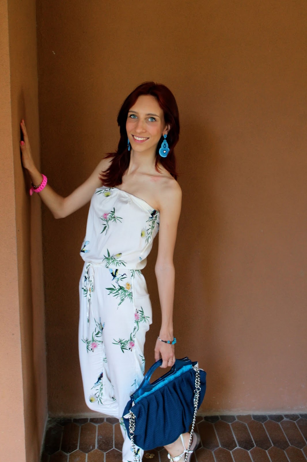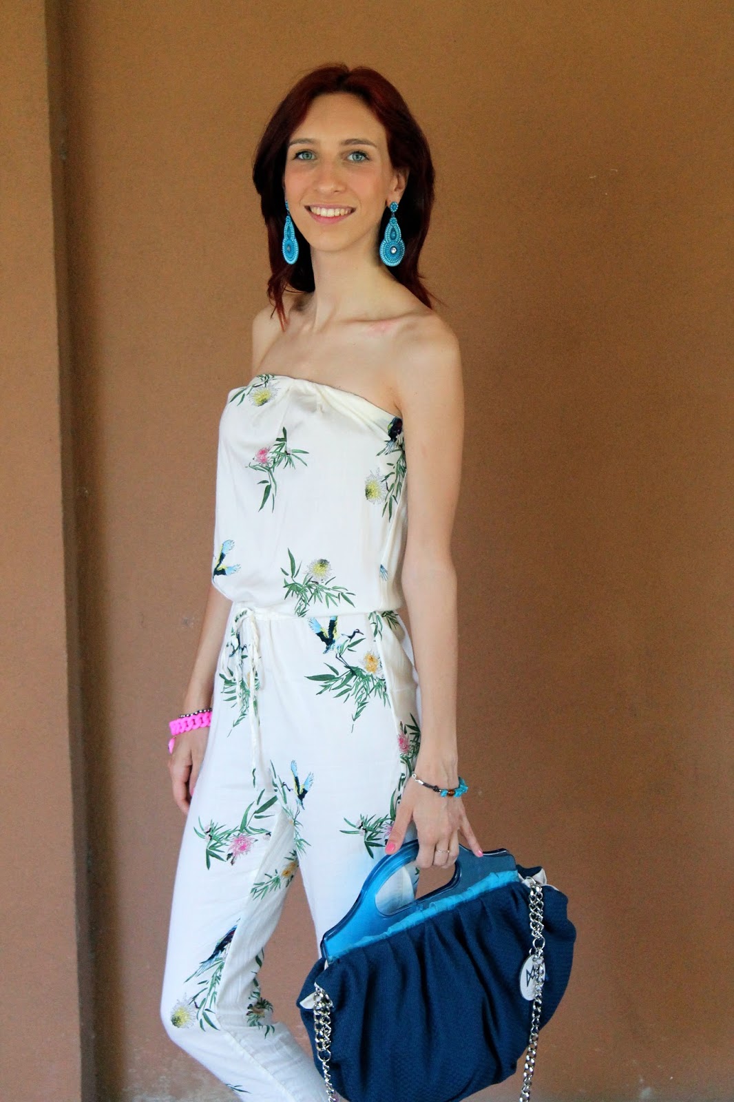 IT: Ed ecco l’ultimo outfit che ho utilizzato per l’evento Pitti immagine, che si è svolto a Firenze presso la Fortezza da Basso. Ho voluto creare un look perfetto per tutti i giorni, comodo, versatile e soprattutto fashion e glamour, formato da una tutina bianca a fantasia abbinata a dei sandali gioiello e a vari accessori colorati, come si può vedere sia dalla borsa, creata dalla mia cara amica Melissa Agnoletti, dagli orecchini azzurri pendenti e dai due bracciali, uno azzurro e l’altro rosa.