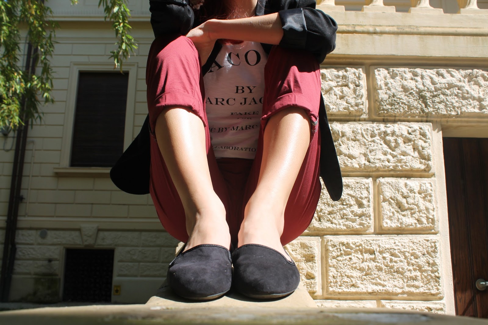 IT: Finalmente un po’ di sole e caldo per questa domenica di giugno, visto il tempo ho pensato di costruire un look estivo e comodo, per qualsiasi occasione. Questo outfit è costituito da una semplice t-shirt bianca e nera, un pantalone bordeaux a pinocchietto, una giacca nera e un paio di pappucce dello stesso colore. Come accessori ho usato un paio di orecchini pendenti giocando sui colori del bianco e nero e come borsa la famosa Dior Diorissimo.