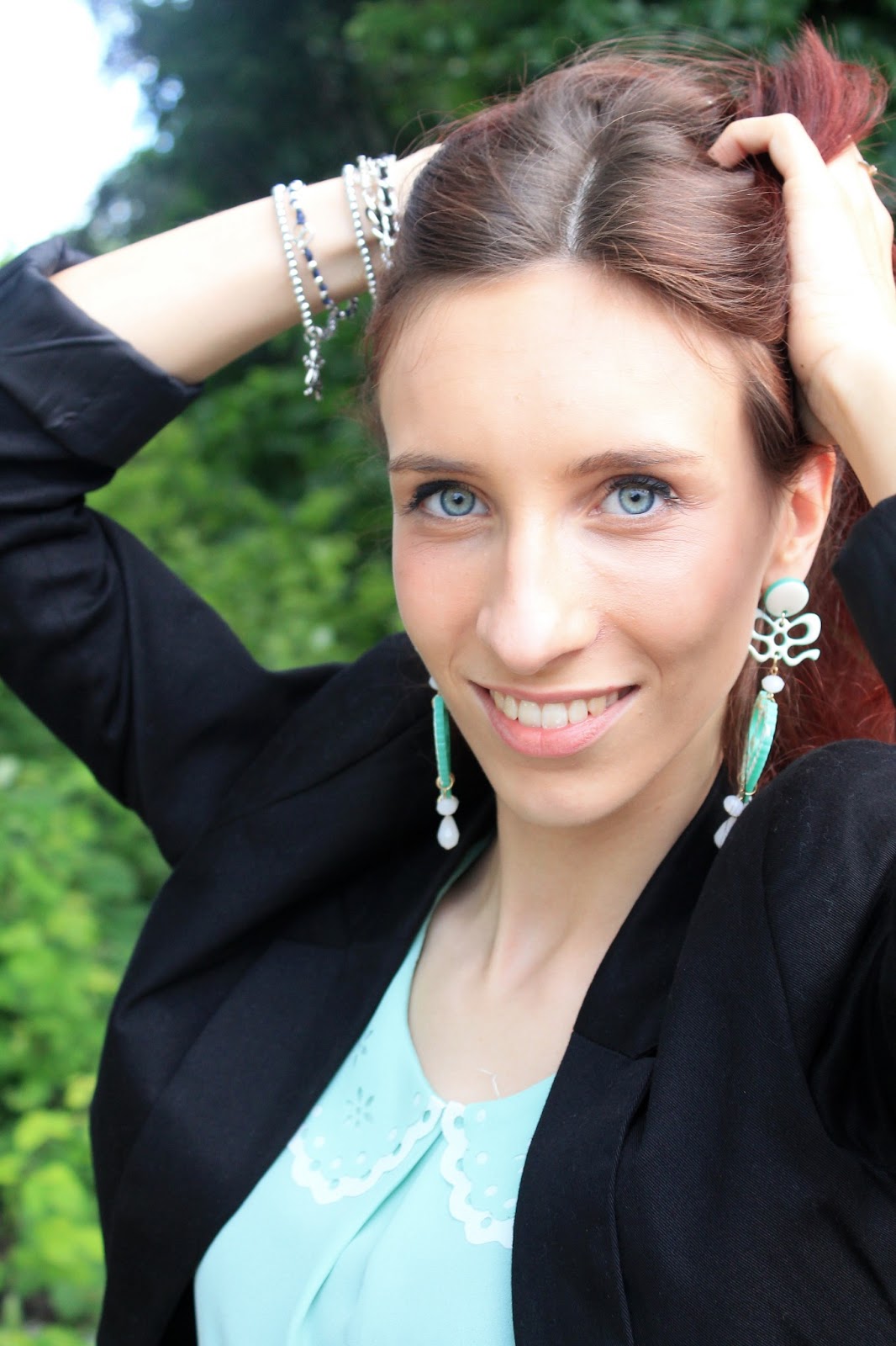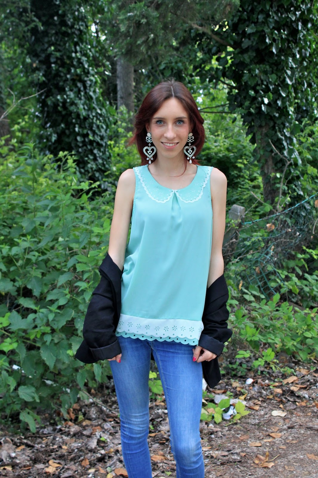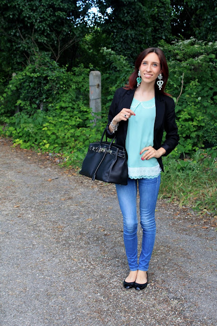 IT: Questo pomeriggio ho deciso di creare un look romantico, quello che più mi si addice, composto da una maglia con ricami che assomigliano alla fantasia del pizzo, stile retrò, abbinata ad un paio di orecchini dello stesso colore. Per personalizzare il tutto e renderlo mio ho aggiunto una giacca semplice nera, un paio di ballerine e la storica Birkin di Hermès. Vi piace questo outfit?