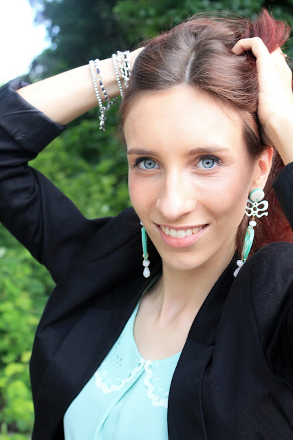 EN: This afternoon I decided to create a romantic look, the one that suits me, made of a mesh with embroidery that resemble fancy lace, retro style, combined with a pair of earrings of the same color. To customize the whole thing and make it my own I added a simple black jacket, a pair of dancers and the historic Hermès Birkin. Do you like this outfit?
