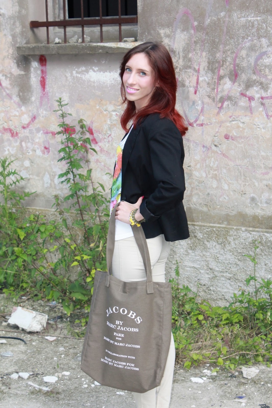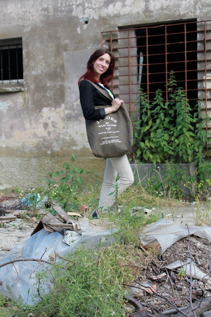 EN: I show you a sporty look but at the same time glamorous and perfect for all occasions, for a simple walk until you get to have a drink. With this outfit you want to show especially the new bag Kate by Melissa Agnoletti. This maxi bag has printing by Marc Jacobs, a must have this season. I wanted to combine a simple t-shirt with floral print, in the classic biege pants and a pair of black flats.