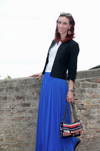 EN: It ‘a bit of time that I try a skirt like this, down to the foot and especially colorful, a beautiful bright blue, I finally found it, and I have not done anything but combine it with a simple white t-shirt and short a cotton jacket. This look today I especially liked, because it is quite different from the usual and very fresh. What do you think of this outfit?
