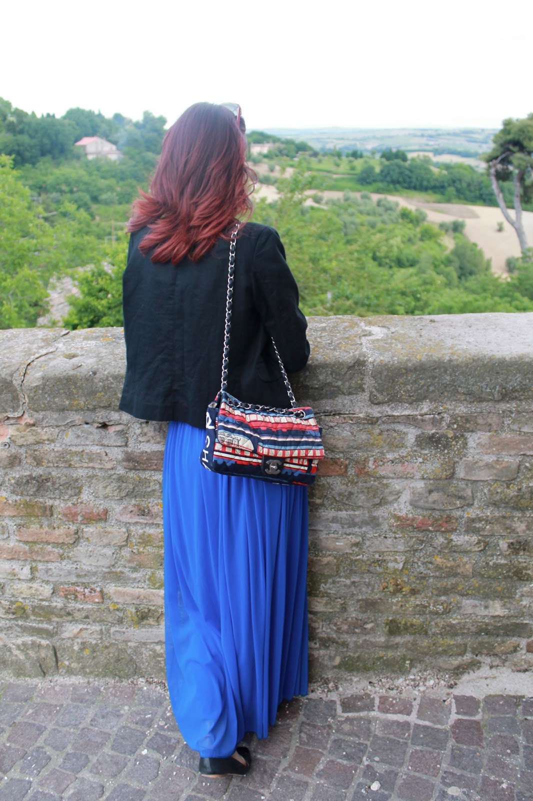 EN: It ‘a bit of time that I try a skirt like this, down to the foot and especially colorful, a beautiful bright blue, I finally found it, and I have not done anything but combine it with a simple white t-shirt and short a cotton jacket. This look today I especially liked, because it is quite different from the usual and very fresh. What do you think of this outfit?