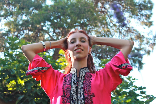 ES: Después de un agitado día como el de ayer, incluyendo almuerzos, cenas y compras hoy os muestro el look que he creado para esta tarde, soleado pero no demasiado caliente. Este equipo consta de una blusa fucsia con ribete plateado, y un pantalón de mezclilla. Como accesorios he usado un brazalete de plata decorado con piedras y, como una bolsa, el histórico Hermès Birkin.