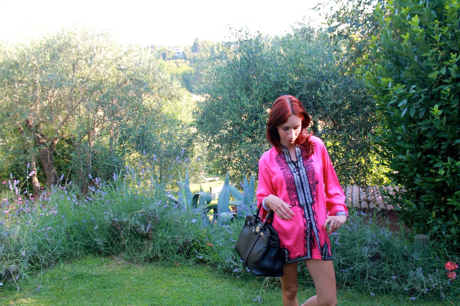 IT: Dopo una giornata frenetica come quella di ieri, tra pranzi, shopping e cene oggi vi mostro il look che ho creato per questo pomeriggio non molto soleggiato ma caldo. Questo outfit è composto da una blusa fucsia con rifiniture argentate e uno shorts di jeans. Come accessori ho utilizzato un bracciale di argento decorato con pietre e, come borsa, la storica Birkin di Hermès.