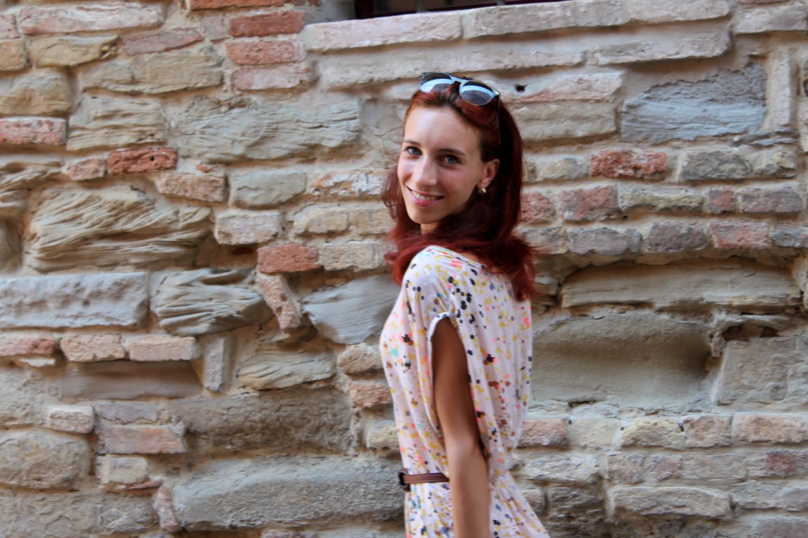 IT: Il protagonista di oggi è sicuramente il vestito che indosso, colorato e molto comodo. Ho voluto dare un tocco in più a questo look aggiungendo una cinta in cuoio sul punto vita e altri vari accessori come i sandali intrecciati e la borsa che, con la sua forma, mi ricorda un modello vintage.