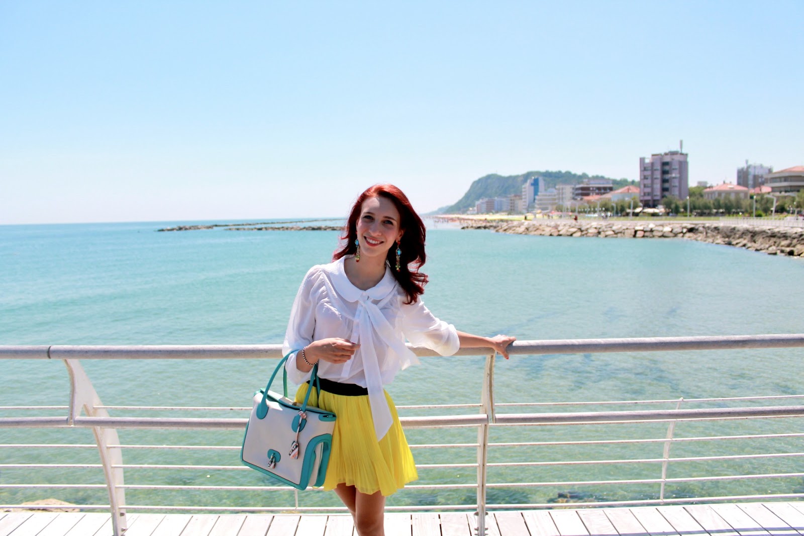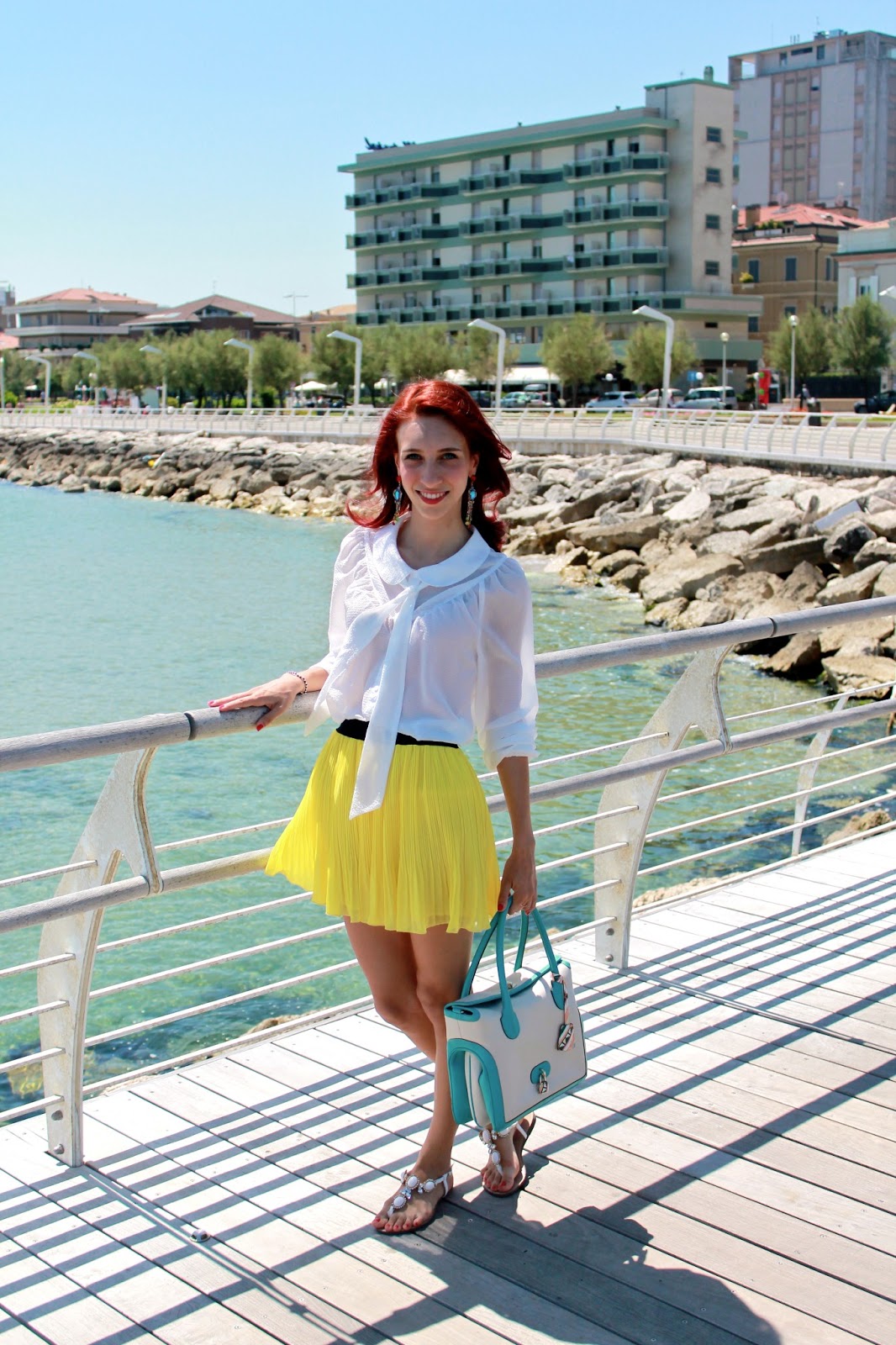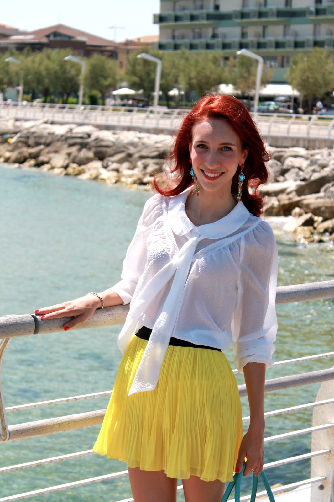 IT: Sole, tanto sole e soprattutto tanto caldo, temperatura perfetta per indossare una gonna e una camicia leggera. In queste giornate non deve mancare assolutamente il colore, per questo motivo oggi ho giocato con le tonalità del giallo, del verde acqua e del bianco, e come accessorio per unire il tutto ho utilizzato gli orecchini multicolore.