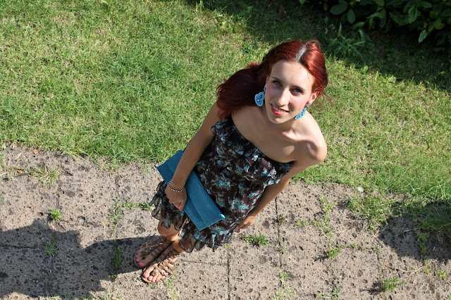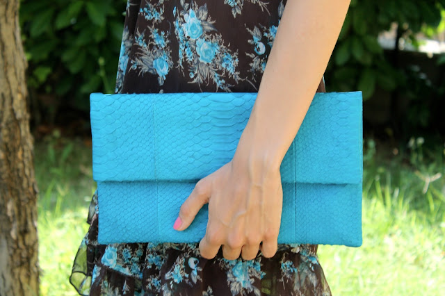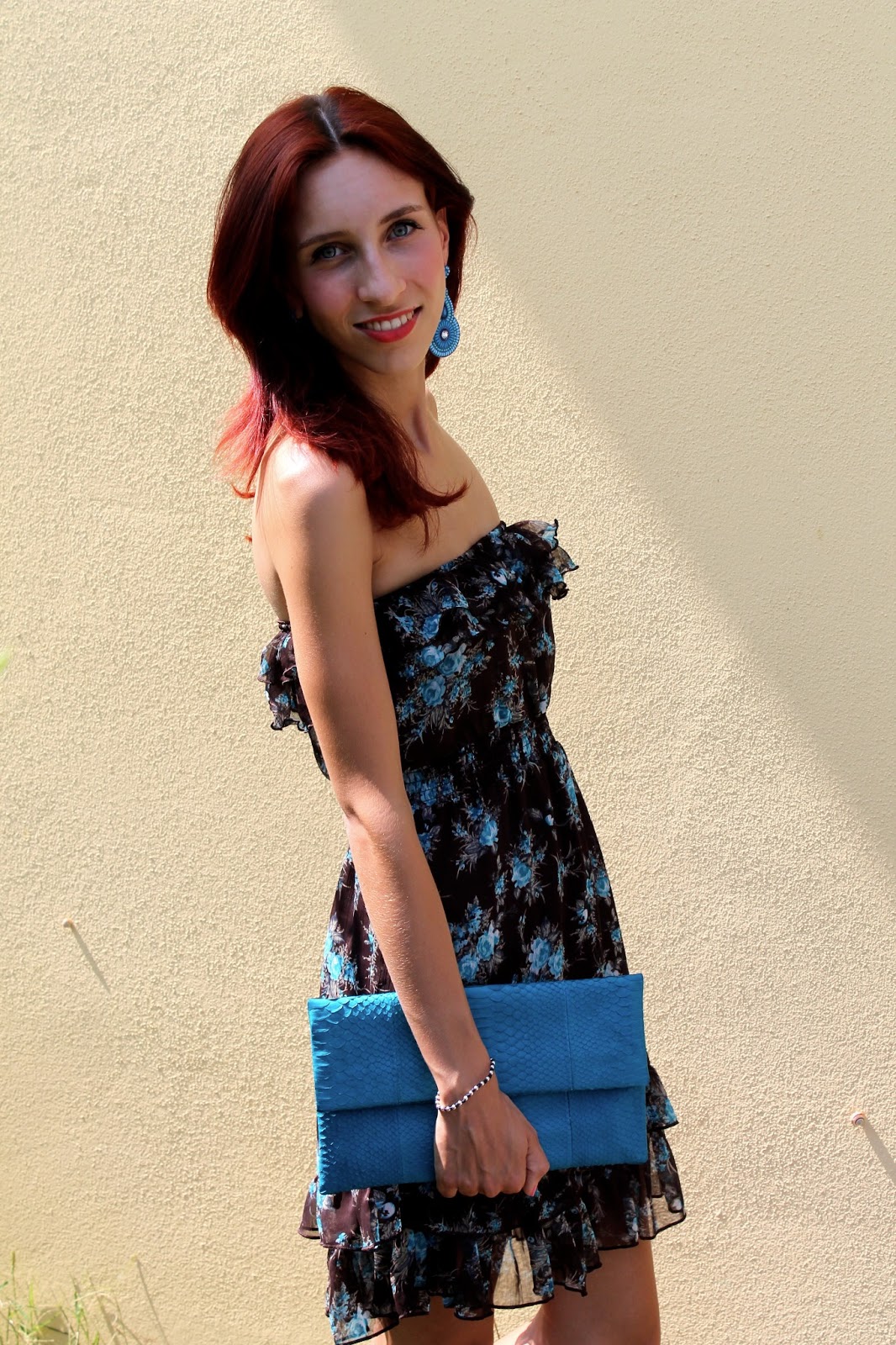 EN: The outfits today is mainly composed of two colors together that I really like, or brown and blue; This combination of tones in my complexion is perfect for it too sorry it too light, a middle way, which is why today I decided to create this look, consisting of a short dress with floral pattern, a python clutch bag and a pair of earrings that reflect the colors of the dress.