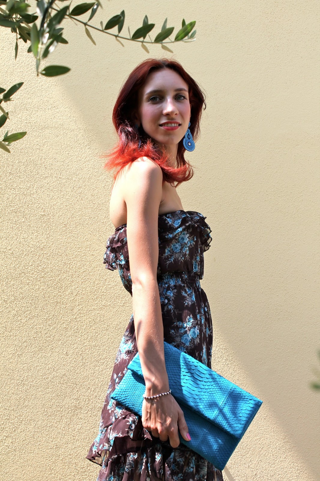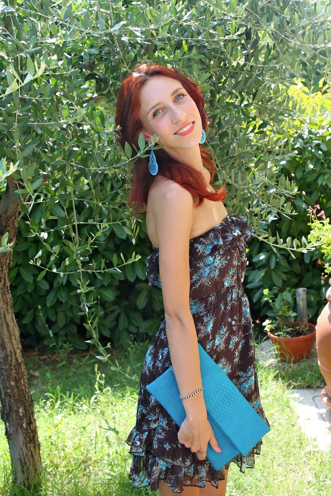 IT: L’outfit di oggi è composto principalmente da due colori che insieme mi piacciono molto, ovvero il marrone e l’azzurro; Questa combinazione di tonalità secondo me è perfetta per una carnagione ne troppo scusa ne troppo chiara, una via intermedia, per questo motivo oggi ho deciso di creare questo look, composto da un vestito corto a fantasia floreale, una pochette pitonata e un paio di orecchini che riprendono i colori del vestito.
