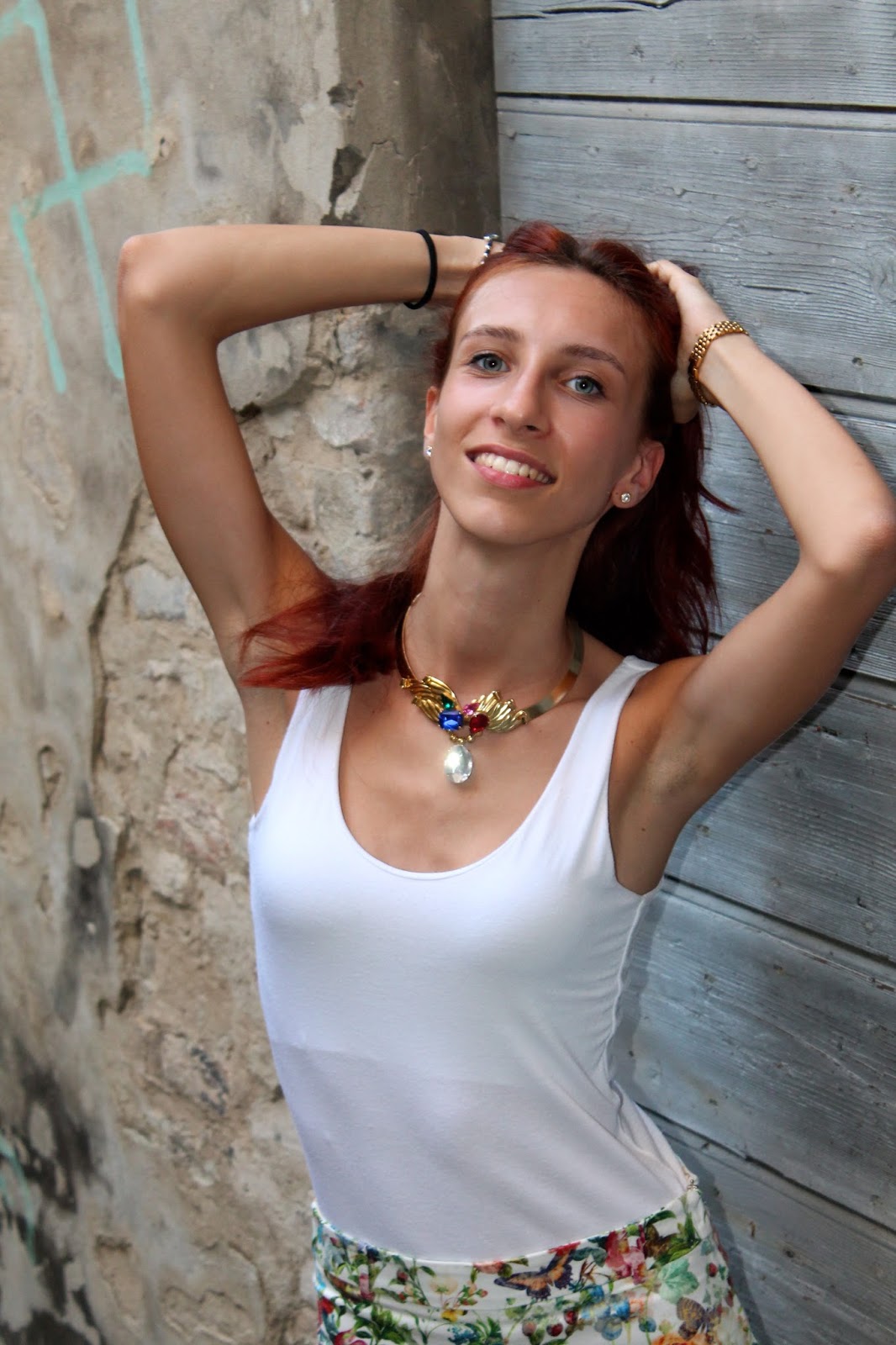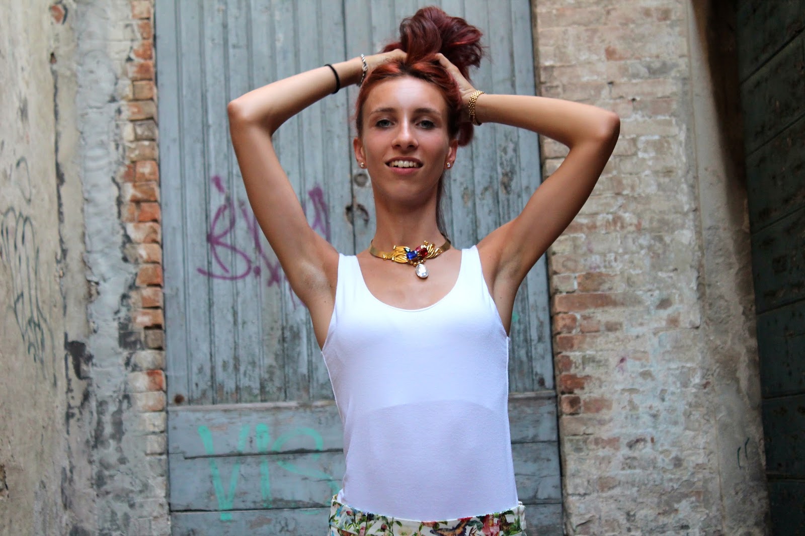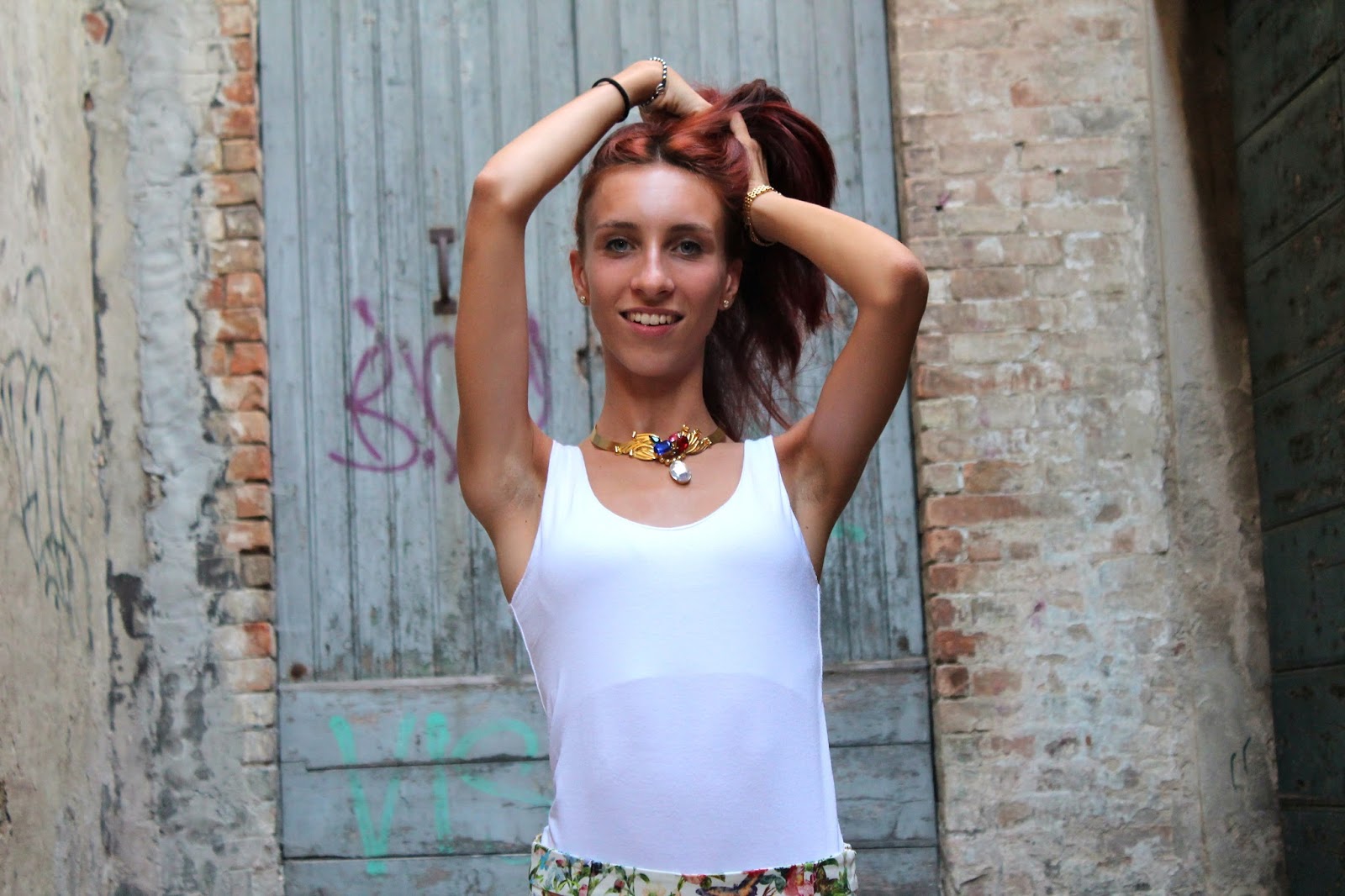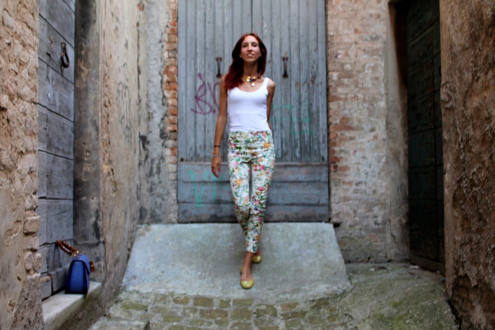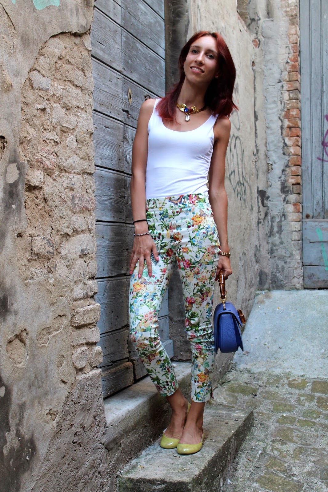 IT: Adoro questi pantaloni, a fantasia floreale multicolore, penso che siano perfetti da abbinare a tutto quello che si preferisce a meno che sia a tinta unita, per questo motivo oggi ho voluto indossarli con delle semplici ballerine in gomma gialle di Borbonese, a una t-shirt bianca e alla storica Gucci Bamboo indossata diverse volte nei miei outfit passati. Come accessori ho voluto utilizzare pezzi vintage, che mi piacciono molto, come la collana con pietre colorate su base dorata e un orologio a quadrante piccolo e maglia intrecciata.