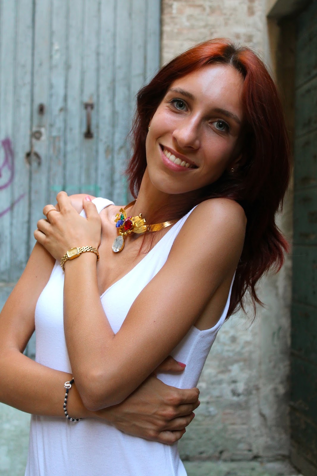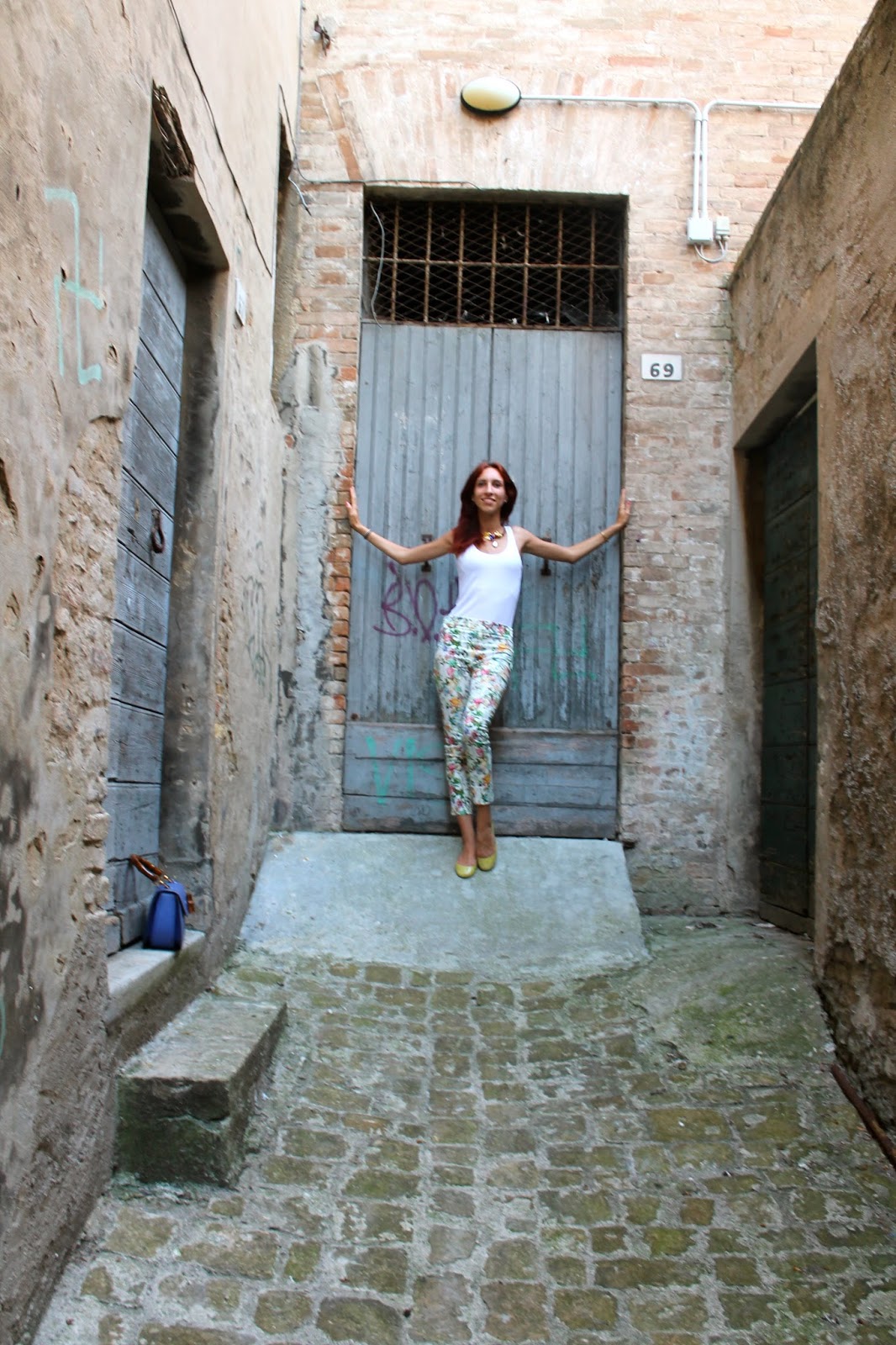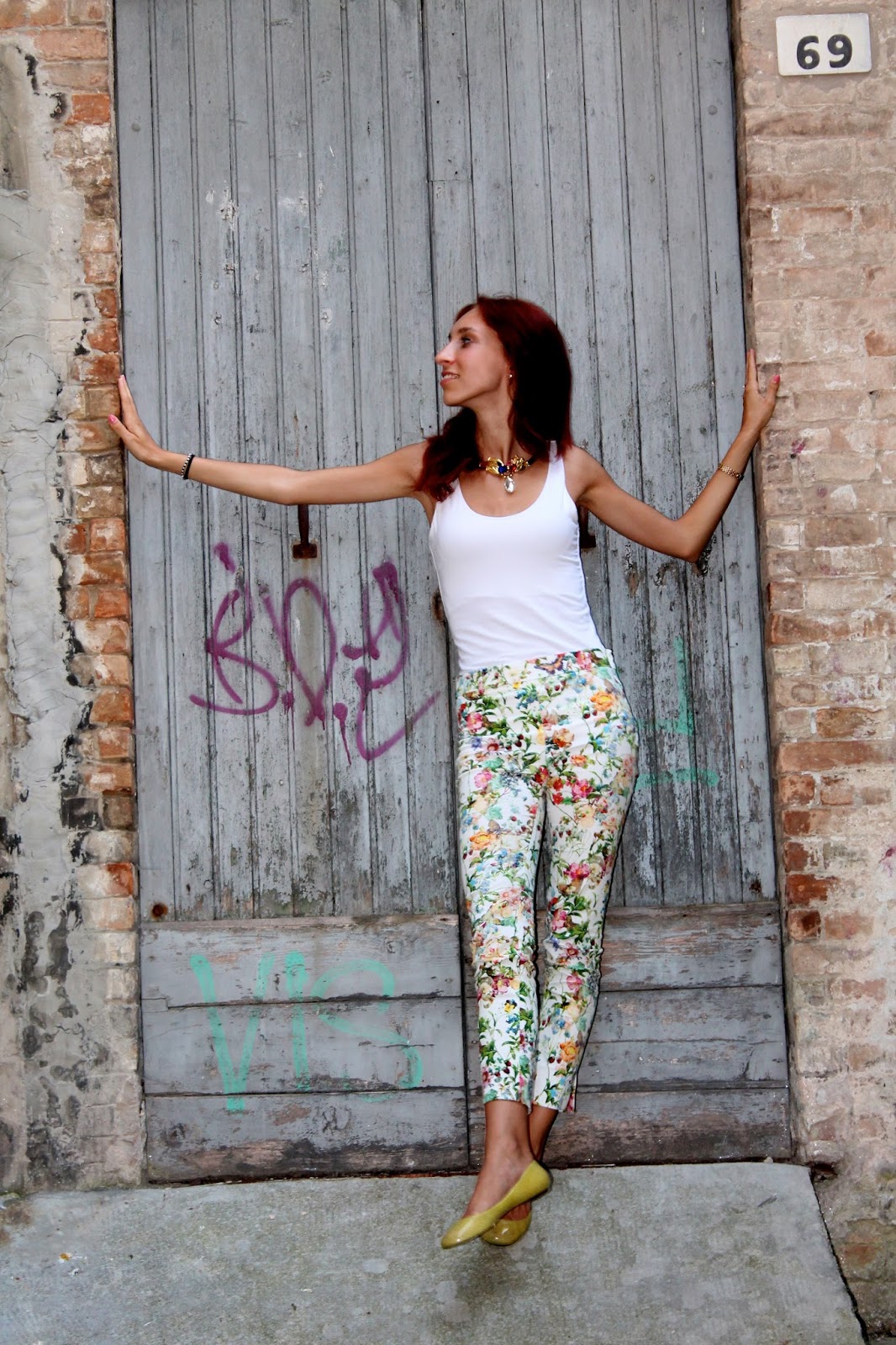 EN: I love these pants, patterned multicolored floral, I think they are perfect to match with everything you prefer unless it is plain, that is why today I had to wear them with simple ballet flats in yellow rubber of Borbonese, a t-shirt and the historic Gucci Bamboo outfits worn several times in my past. As accessories I wanted to use vintage pieces, which I really like, such as necklace with colored stones on golden base and a clock in the small dial and interlock knit.