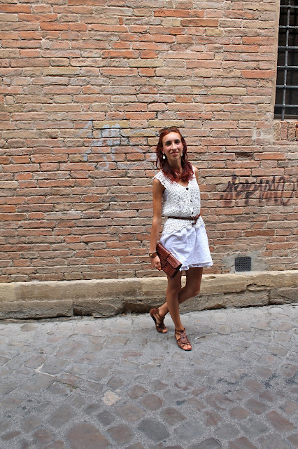 EN: This is not very sunny day I decided to build a look a bit ‘different from the usual add to a simple white dress a cotton vest and a belt at the waist. As for the accessories I wanted to perfect everything is modern with objects, such as the clutch that resembles the pattern of Hermès and gladiator sandals, and vintage pieces like earrings, necklace etc..