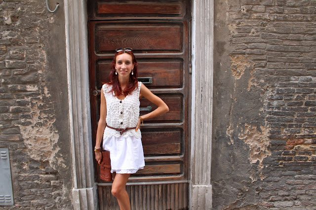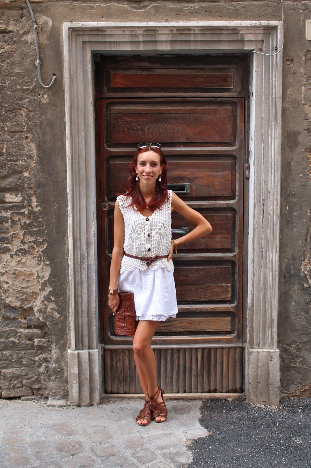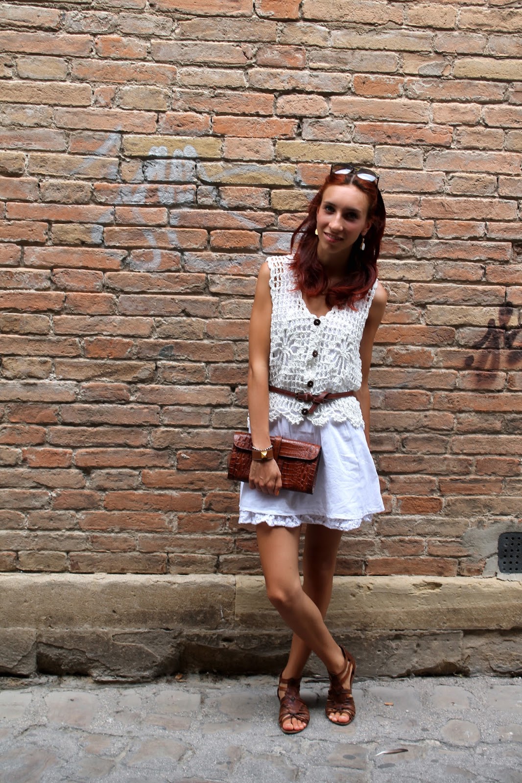 EN: This is not very sunny day I decided to build a look a bit ‘different from the usual add to a simple white dress a cotton vest and a belt at the waist. As for the accessories I wanted to perfect everything is modern with objects, such as the clutch that resembles the pattern of Hermès and gladiator sandals, and vintage pieces like earrings, necklace etc..