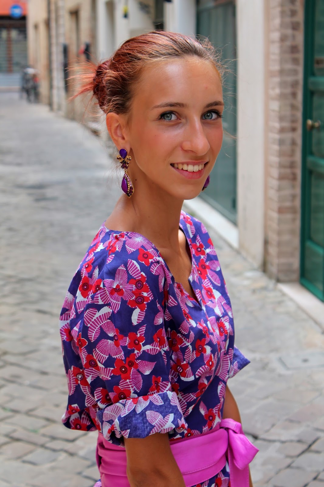 Carinissimo questo outfit super colorato! Mi piace molto l'abbinamento viola-rosso (aranciato?).