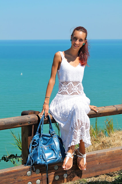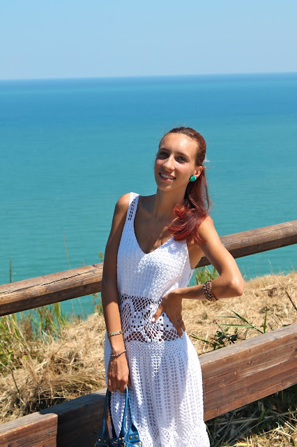 EN: The places of the sea have always been my favorite. A perfect match for me with the blue of the water is definitely the white when you have a darker complexion for tanning, which is why today I wanted to dedicate myself to the tones of blue and white in fact, I paired this long dress made hand crochet a maxi bag model inspired by Balenciaga and accessories that stand out very colorful sull’outfit. The location I chose to take these pictures is Mount San Bartolo with a view nothing short of perfect, overlooking the sea at Pesaro.