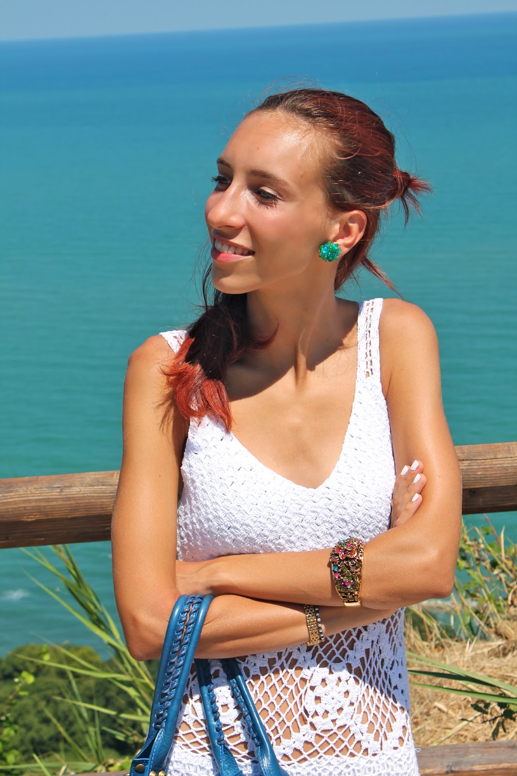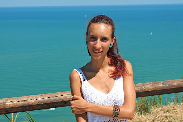 EN: The places of the sea have always been my favorite. A perfect match for me with the blue of the water is definitely the white when you have a darker complexion for tanning, which is why today I wanted to dedicate myself to the tones of blue and white in fact, I paired this long dress made hand crochet a maxi bag model inspired by Balenciaga and accessories that stand out very colorful sull’outfit. The location I chose to take these pictures is Mount San Bartolo with a view nothing short of perfect, overlooking the sea at Pesaro.