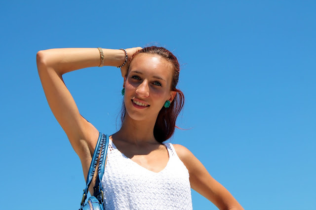 ES: Los lugares del mar siempre ha sido mi favorito. Un complemento perfecto para mí con el azul del agua es sin duda el blanco cuando se tiene una tez más oscura para el bronceado, por lo que hoy quería dedicarme a los tonos de azul y blanco, de hecho, he emparejado este vestido largo hecho ganchillo de la mano de un modelo maxi bolso inspirado en Balenciaga y accesorios que destacan sull’outfit muy colorido. El lugar que elegí para tomar estas fotos es el Monte San Bartolo con vistas nada de perfecto, con vistas al mar en Pesaro.