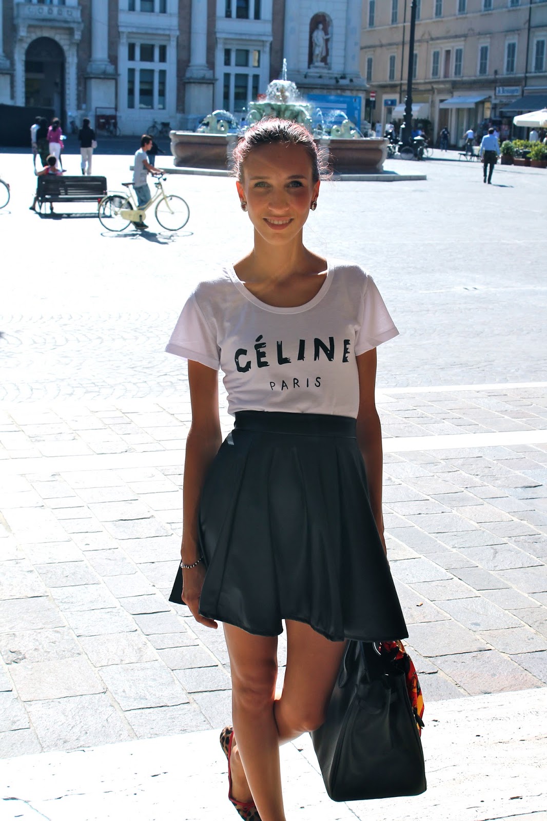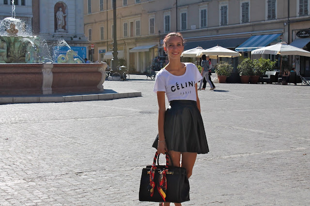IT: Le ultime giornate di caldo e di sole di questo mese di settembre, ne ho approfittato per creare un look ancora abbastanza estivo, perfetto per questo tipo di temperature, gonna a vita alta, t-shirt, ballerine leopardate e maxi borsa. Per quanto riguardo la borsa nera ho pensato di personalizzarla con un foulard colorato che ricorda lo stile di Hermès.