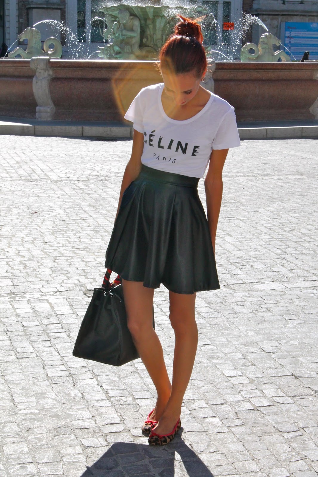 EN: Los últimos días de calor y el sol de este mes de septiembre, que aprovecharon la oportunidad para crear un look todavía bastante verano, perfecto para este tipo de temperaturas, la alta cintura de la falda, camiseta, zapatillas de ballet y maxi bolso de leopardo. En cuanto a la bolsa negro decidí personalizarlo con un pañuelo de colores que recuerda el estilo de Hermès.