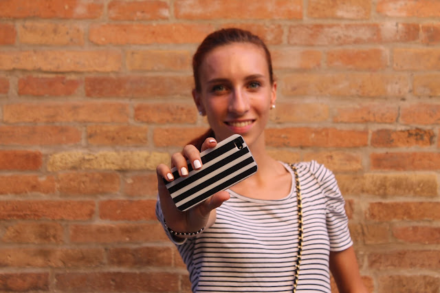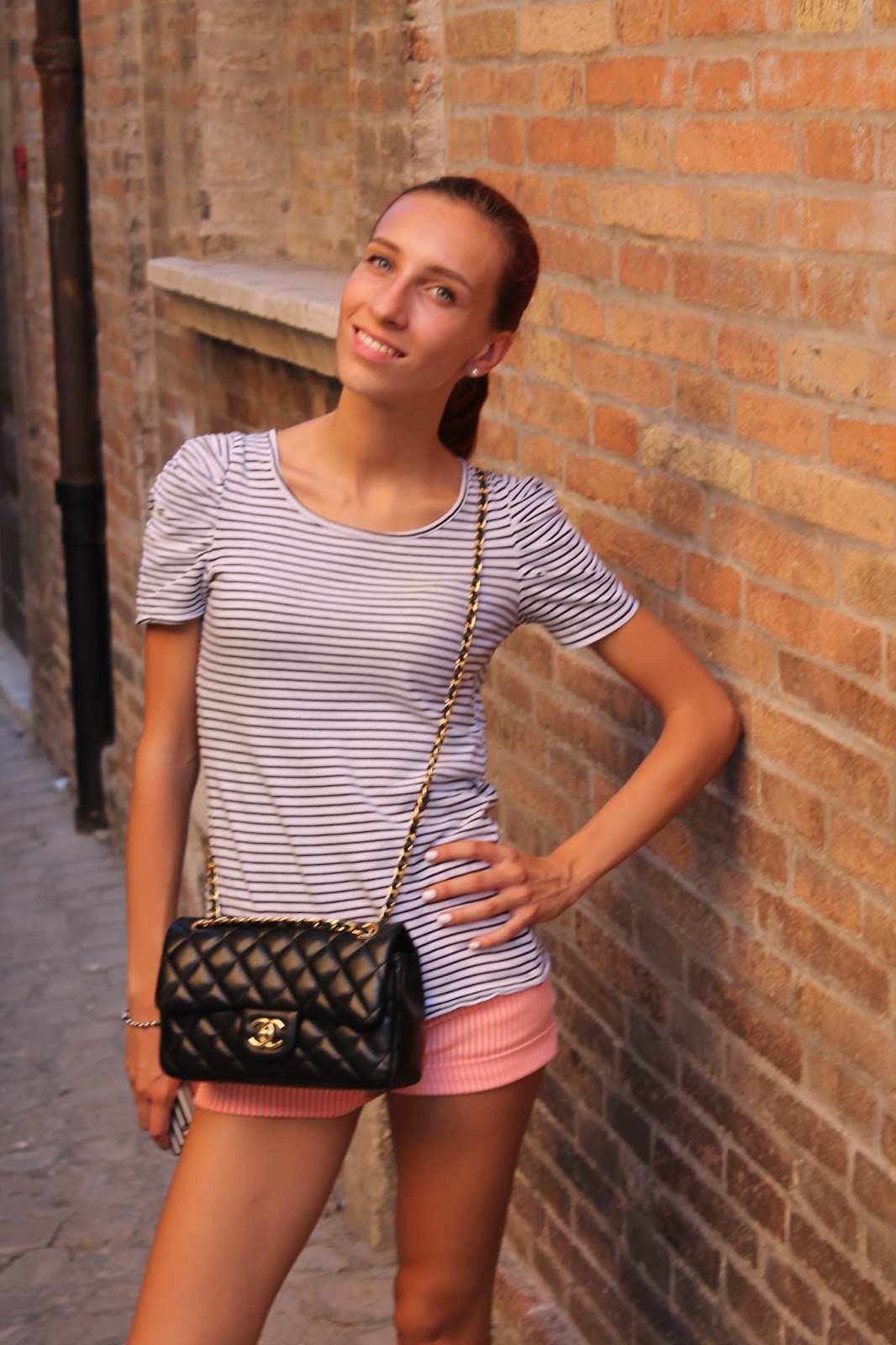EN: A look sporty enough I created for this sunny day, orange and white striped shorts, t-shirts on the colors of black and white sneakers. To customize this outfit very simple and common, I wanted to add one of the bags I prefer, the historic and unique Chanel 2.55, one of the most desired handbags from us women ever since.