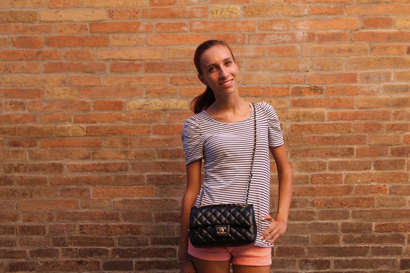 IT: Un look abbastanza sportivo ho creato per questa giornata di sole, shorts a righe arancioni e bianchi, t-shirt sui colori del bianco e nero e scarpe da ginnastica. Per personalizzare questo outfit molto semplice e comune, ho voluto aggiungere una tra le borse che preferisco, la storica e unica Chanel 2.55, una tra le borse più desiderate da noi donne da sempre.
