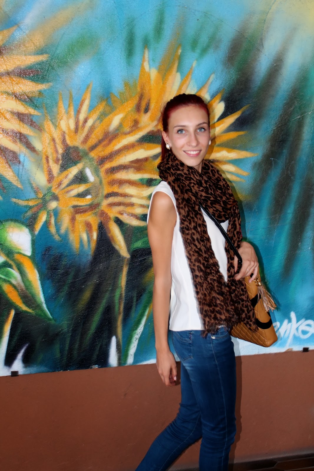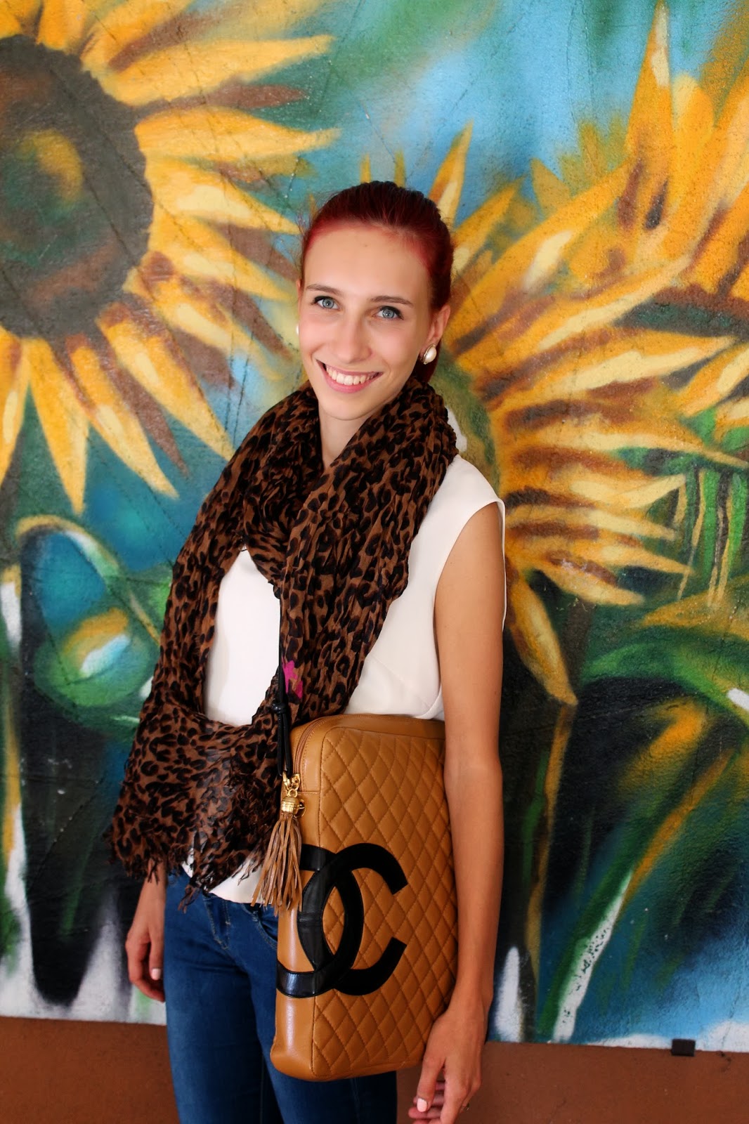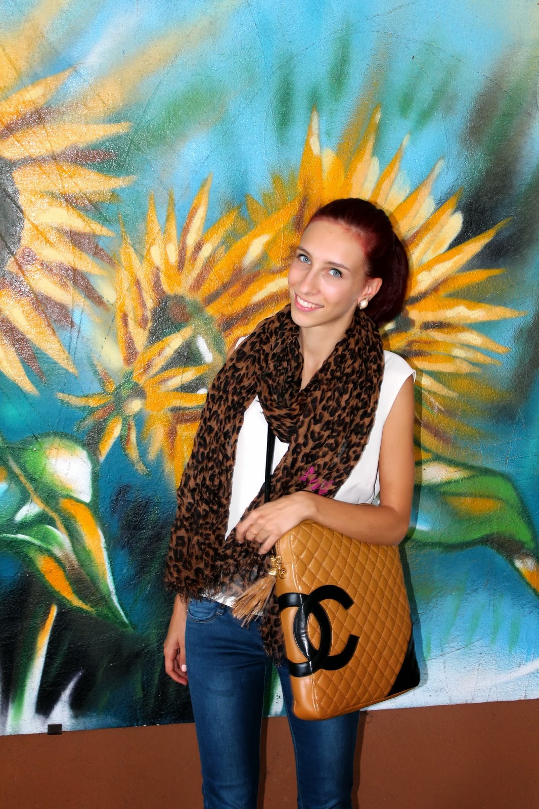 IT: I girasoli, uno dei miei fiori preferiti, avere questo magnifico dipinto come sfondo per le foto oggi ha fatto si che risaltasse il mio look, toni chiari ma sempre eleganti, beige, bianco e nero.. una canotta, dei semplici jeans, delle ballerine, una sciarpa leopardata e una Chanel come borsa vintage.