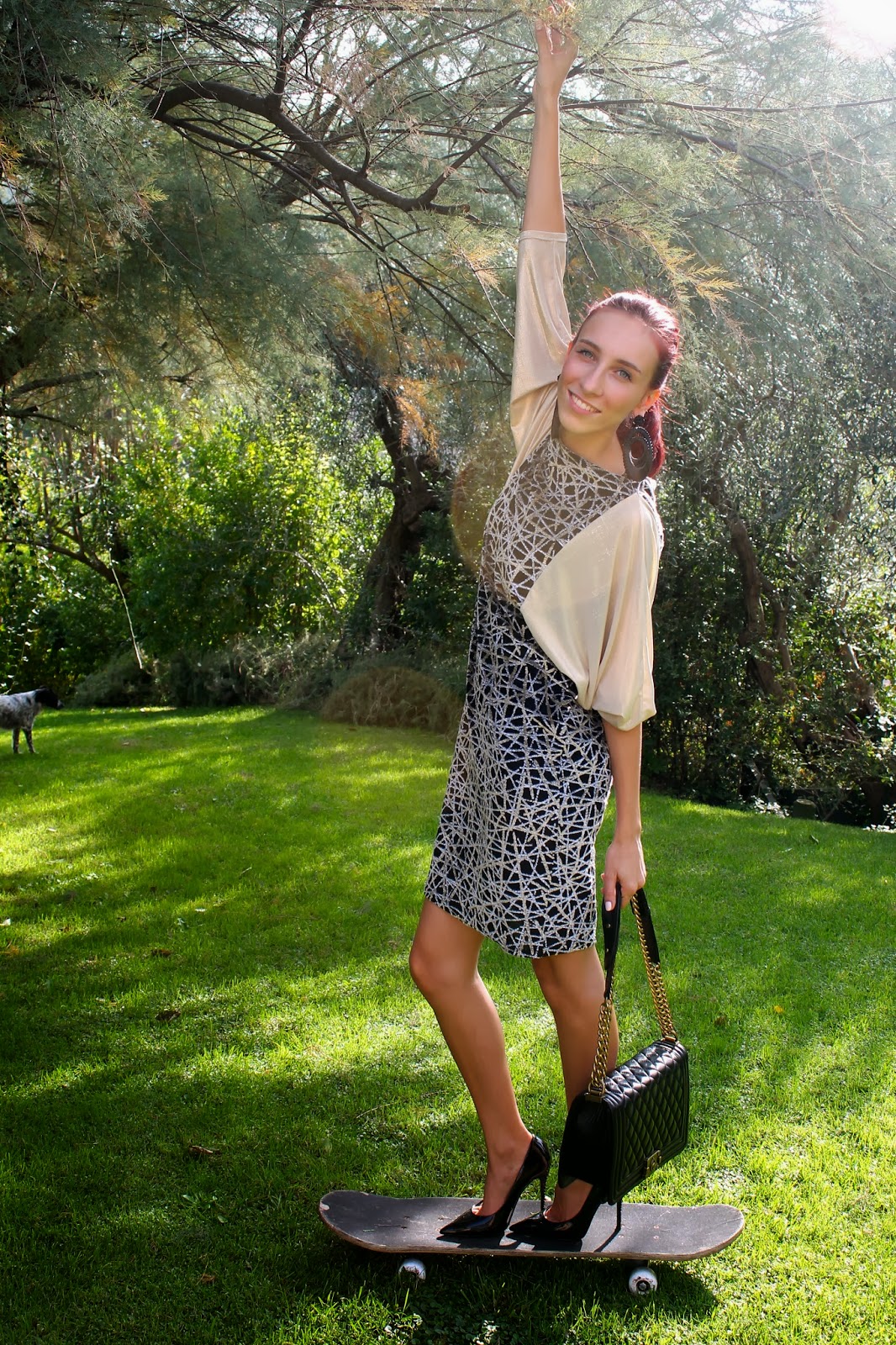 EN:A stylish look that put in comparison to a model of girl who does not always want to be earnest in his image, in these photos taken by my boyfriend I want to show another side of me, the child, when you are having fun while taking pictures for the blog. I created this day for an outfit in shades of black, silver and gold, the line of the dress is reminiscent of the 60s. I wanted to combine this head a décolleté black paint and a bagreminiscent of the pattern made by Chanel, Boy.