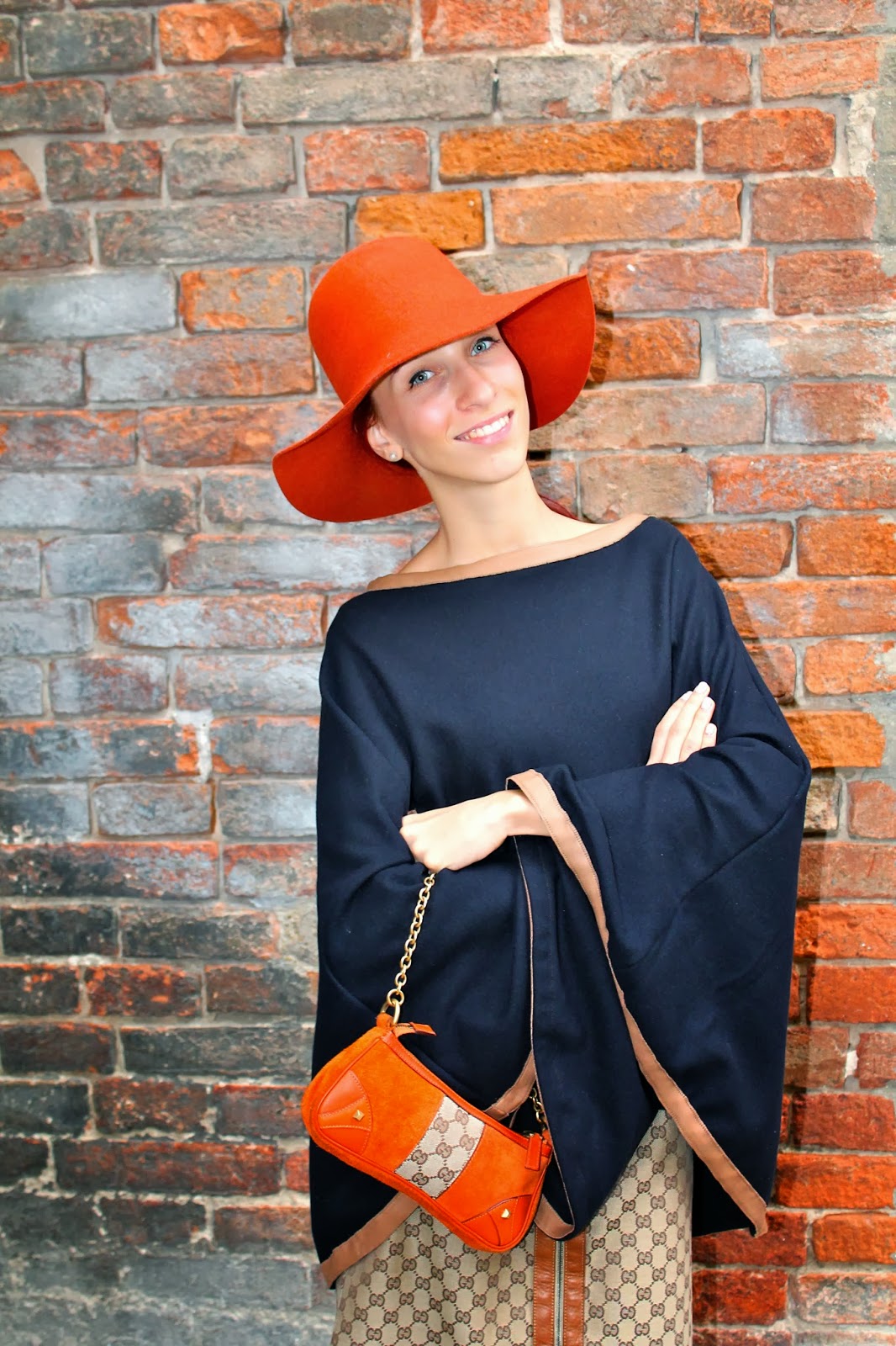 IT: I cappelli possono dare un tocco di eleganza e classe se indossati con capi classici e che non passeranno mai di moda, come la mantellache oggi vi mostro, un must have di questo inverno, viste e straviste da persone famose e modelle. Oggi ho deciso di abbinarla ad una gonna monogrammata di Gucci, a una borsa bicolore sempre dello stesso marchio, ad un paio di sandali e ad un cappello appunto, a falda larga arancione.