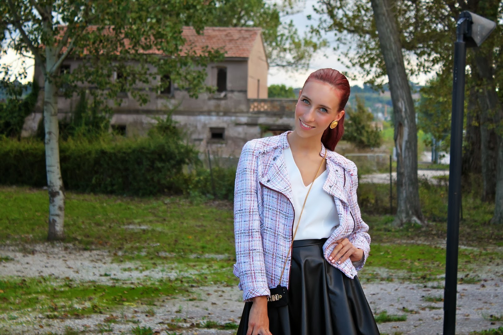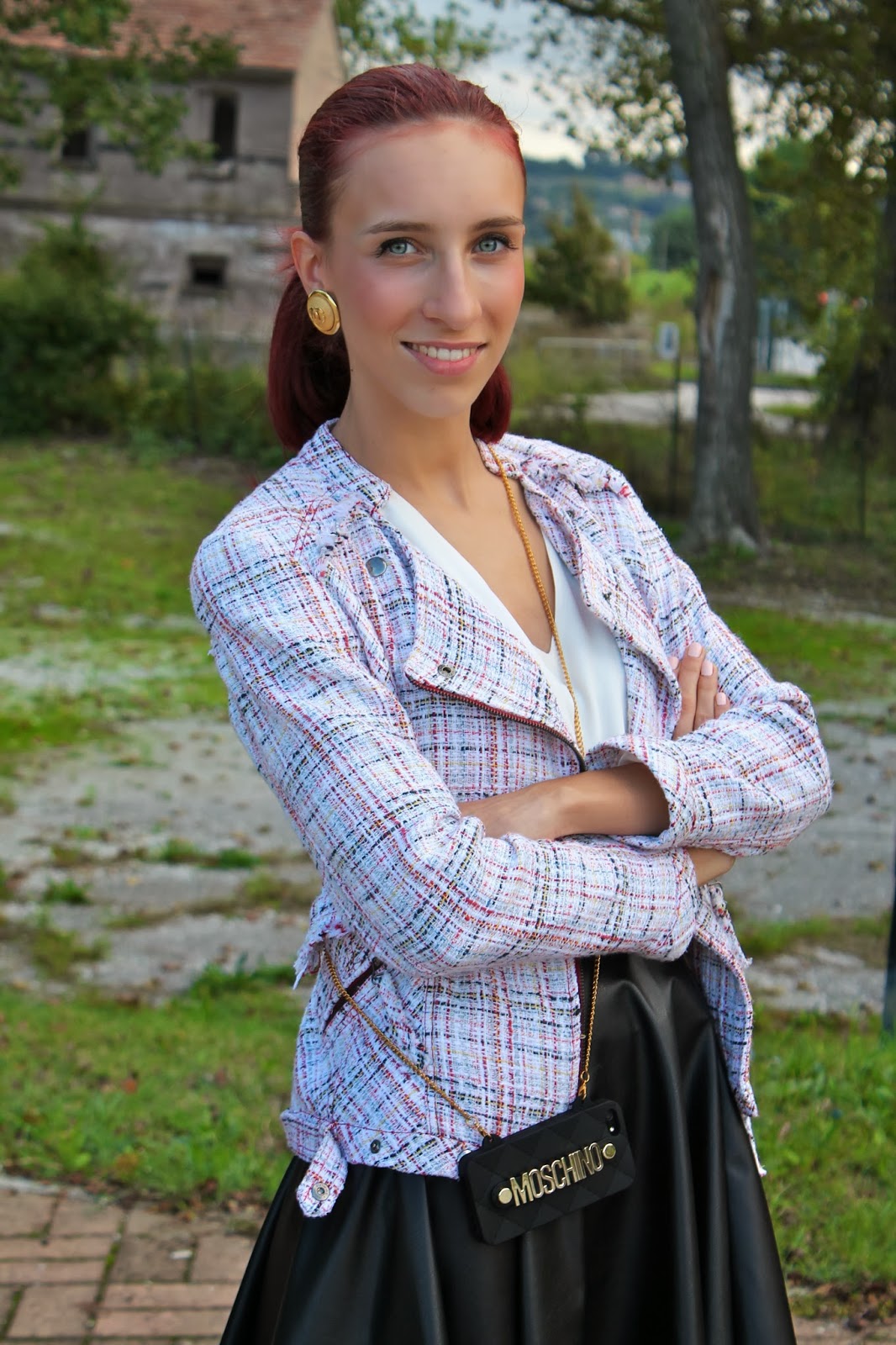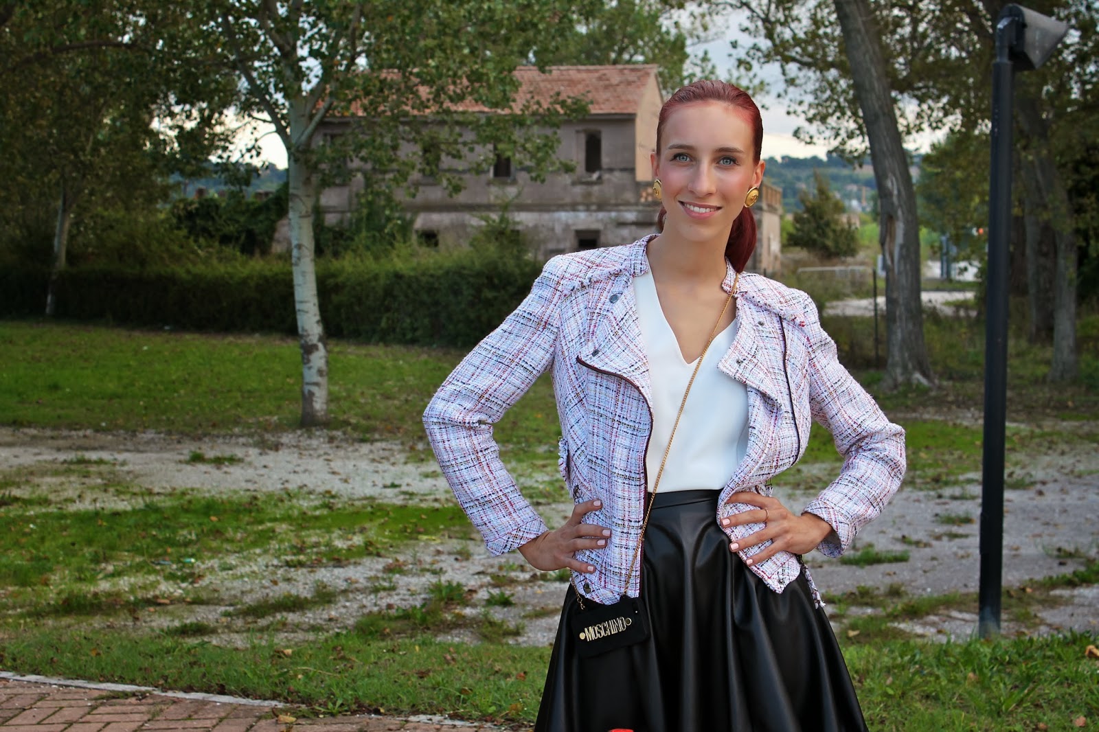 EN: Today I wanted to create a simple look but at the same time chic and fashion, black skirt, white tank top, patterned jacket, red shoeand iPhone case. I love this mini bag, nice and fun, perfect for creating a glamorous outfit, what do you think?