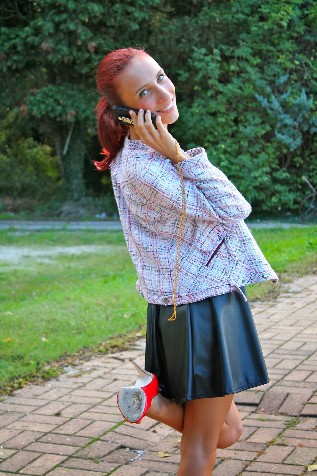 IT: Oggi ho voluto creare un look semplice ma allo stesso tempo chic e fashion, gonna nera, canotta bianca, giacca a fantasia, scarparossa e custodia per iPhone a tracolla. Adoro questa mini borsa, simpatica e divertente, perfetta per creare un outfit glamour, cosa ne dite?