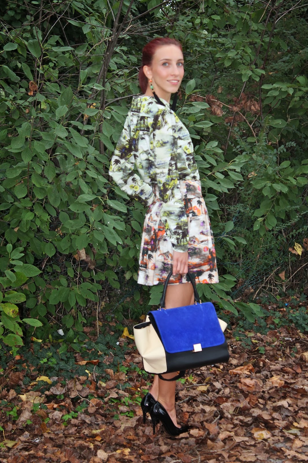 IT: Una gonna e una camicia della stessa fantasia, l’unica differenza che si può notare è assolutamente il colore, la camicia è sulle tonalità del verde mentre, per quanto riguarda la gonna, è sui toni dell’arancione. Ho voluto abbinare questi due capi insieme che secondo il mio punto di vista possono creare un outfit unico e particolare, per arricchire e perfezionare questo look ho pensato di mettere come borsa la mia adorata Céline, unica nei suoi colori.