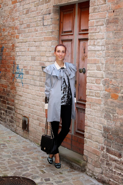 IT: Oggi vi mostro un look elegante ma che può essere anche perfetto per un pomeriggio autunnale, un soprabito, una camicia a pois e un paio di pantaloni neri, con ai piedi delle scarpe con il tacco ricamate con del pizzo. Per quanto riguarda gli accessori ho pensato di non aggiungerli e puntare molto sui capi dell’outfit.