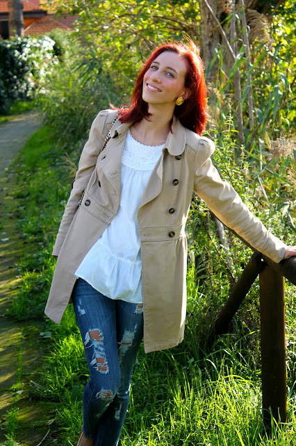 EN: By far one of the outfits that I prefer for both the spring and the autumn is definitely a look on light colors such as beige, blue jeans and white, like the one I used today: a shirt, pants torn , the dancers, a trench coat and a bag of famous brand leopard Stella McCartney.