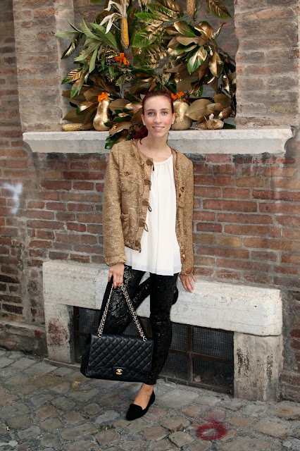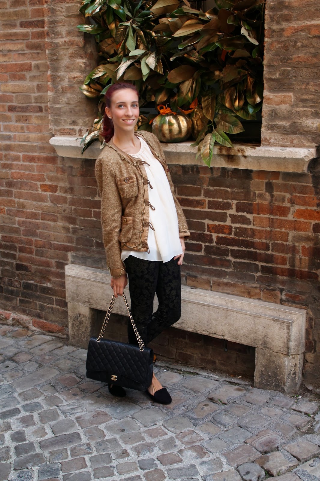 EN: The time for this day does not bode well in my city, they’re coming the rain clouds and, for this reason, today I decided to create a simple look and super comfortable to stand around all day: patterned leggings, colored blouse cream, gold jacket and black pappucce.
