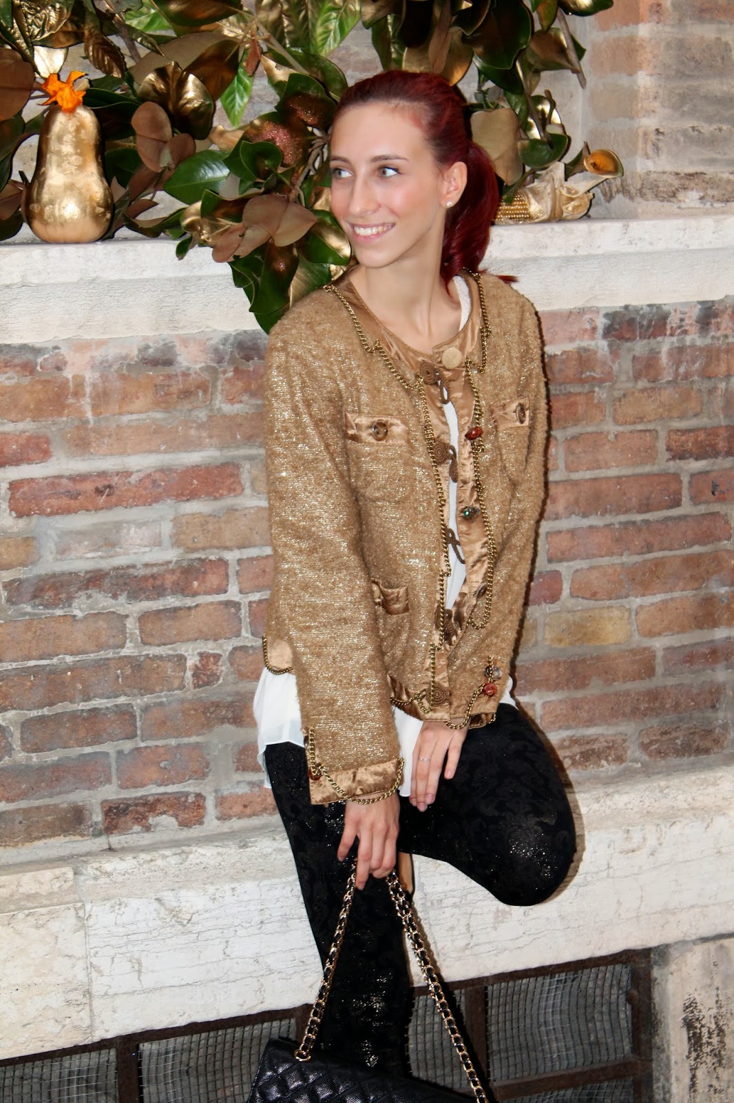 IT: Il tempo per questa giornata non promette bene nella mia città, stanno arrivando le nuvole cariche di pioggia e, per questo motivo, oggi ho deciso di creare un look semplicissimo e super comodo per stare in giro tutto il giorno: leggings a fantasia, blusa color panna, giacca dorata e pappucce nere.