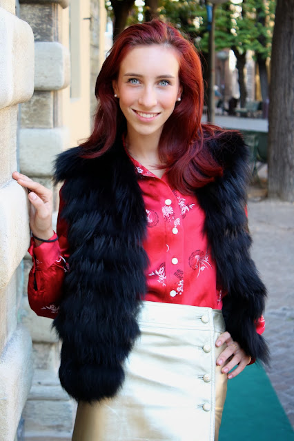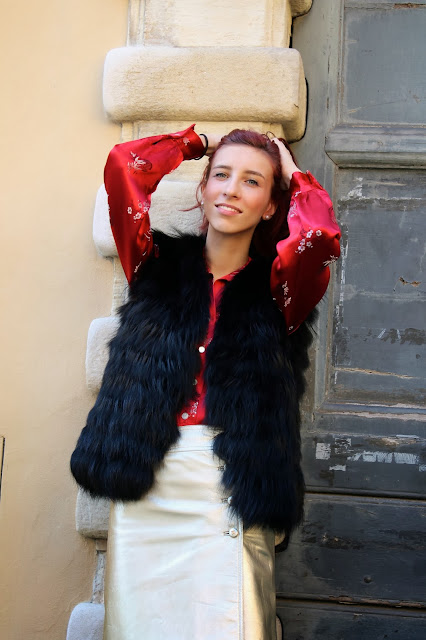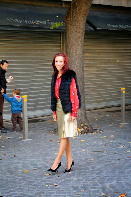 IT: One of my favorite looks, a mix of summer garments and pieces of autumn mixed together to create a unique and colorful outfits. AChinese vintage shirt in shades of red, a skirt golden skin, cleavage of paint and a black fur vest.