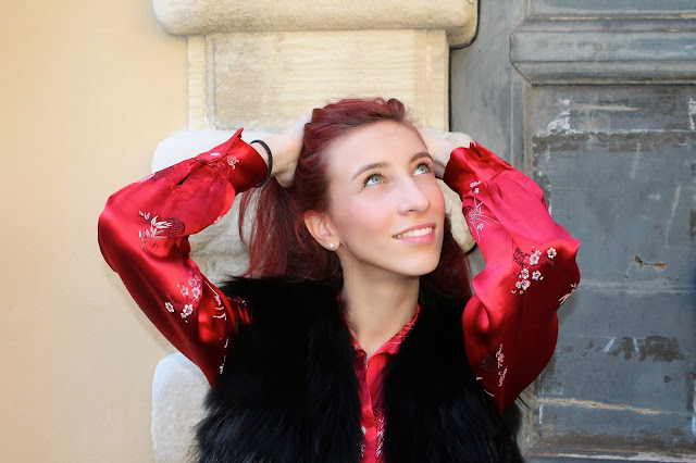 IT: One of my favorite looks, a mix of summer garments and pieces of autumn mixed together to create a unique and colorful outfits. AChinese vintage shirt in shades of red, a skirt golden skin, cleavage of paint and a black fur vest.