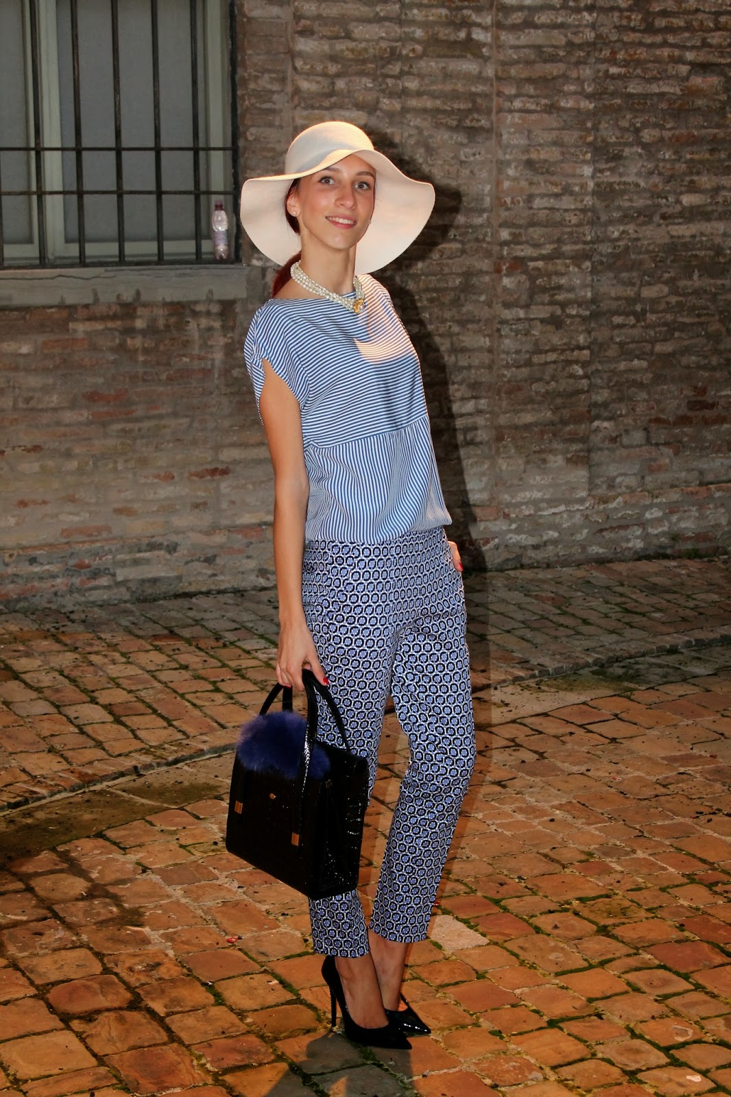 IT: Due fantasie completamente diverse tra loro accostate insieme per creare un look particolare che crea effetti ottici. La cosa che li accomuna sono i colori, il blu e il bianco che riprendono anche gli accessori come la collana, il cappello e il collo di pelliccia, mentre le scarpe e la borsa riprendono la tonalità nera.