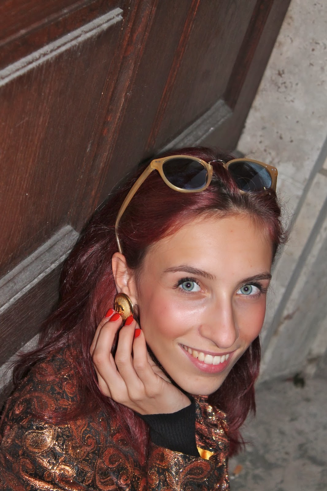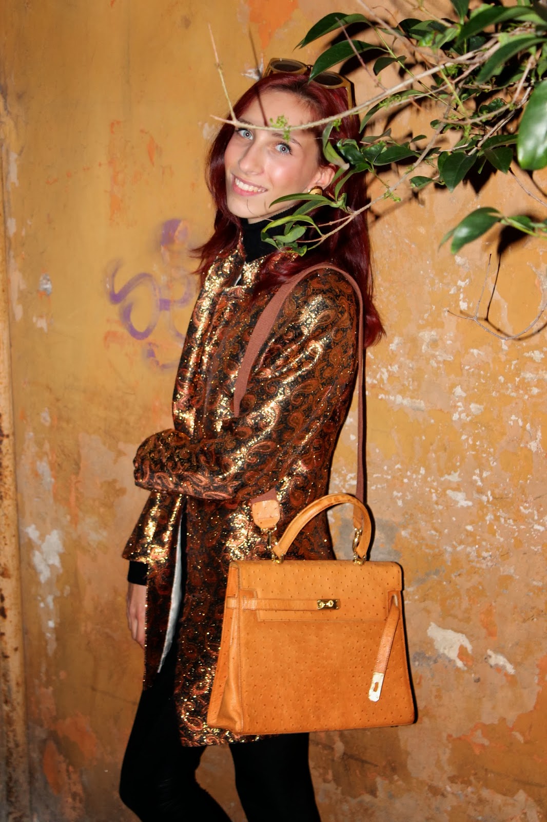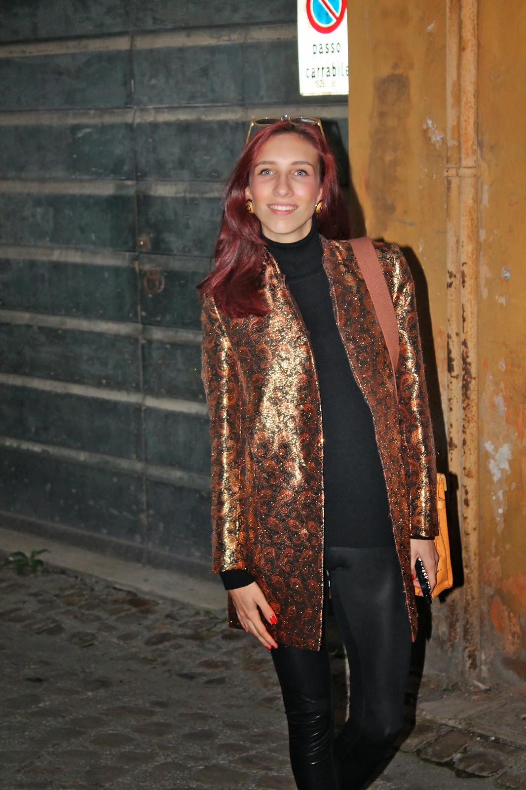 IT: Un look total black sotto e un cappotto che crea l’outfit, ricercato e particolare con i suoi colori vivaci ed eleganti, una tra le tonalità che preferisco in assoluto è sicuramente l’oro. Questo cappotto ha una lunga storia dietro, l’ho trovato in un mercatino vintage e me ne sono innamorata, dopo lunghe sistemazioni sono finalmente riuscita ad indossarlo. Ogni volta che me lo metto faccio sempre un grande figurone, ogni persona mi ferma e mi chiede di che marca è pensando che magari fosse di una ditta molto importante e costosa mentre invece, inconscia del prezzo che l’ha pagato la vecchia padrona, dico orgogliosa che è sartoriale, come si usava una volta, ormai questi pezzi così pregiati sono difficili da trovare, che peccato.