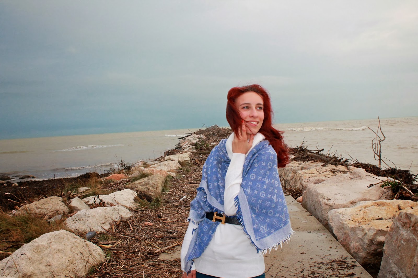 IT: Eccomi tornata con questo articolo da pubblicare, con una grafica nuova e soprattutto tante novità che presto vi svelerò. Intanto per questa giornata voglio mostrarvi un look sui toni del blu e del bianco, elegante ma allo stesso tempo perfetto per ogni occasione, ho utilizzato come accessorio principale la famosa sciarpa di Louis Vuitton, molto conosciuta e vista, reinterpretata in chiave moderna, a mò di scialle. Questa sciarpa l’ho acquistata l’anno scorso ma per il fatto che non sapevo come indossarla viste le sue grandi dimensioni l’ho riposta nell’armadio, mi sembrava uno spreco visto che fosse nuova e ancora intatta, quindi mi sono studiata un modo per indossarla, ed eccolo qui, aggiungendo solo una cinta si può creare un outfit particolare e carino. Cosa ne pensate?